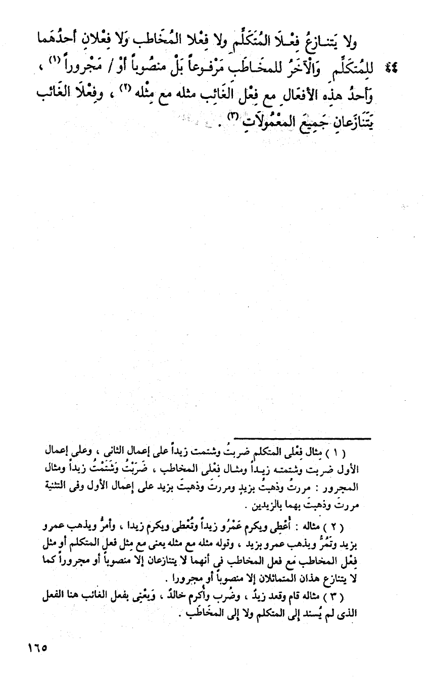 ولا يتنازع فعلا المتكلم ولا فعلا المخاطب ولا فعلان أحدهما للمتكلم والآخر للمخاطب مرفوعا بل منصوبا أو مجرورا، وأحد هذه الأفعال مع فعل الغائب مثله مع مثله، وفعلا الغائب يتنازعان جميع المعمولات.
