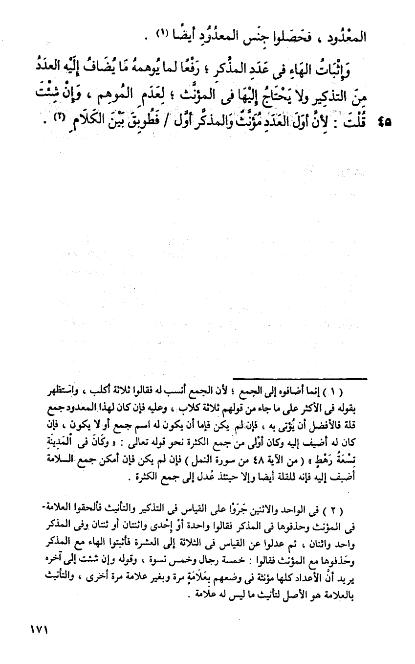 وإثبات الهاء في عدد المذكر، رفعا لما يوهمه ما يضاف إليه العدد من التذكير ولا يحتاج إليها في المؤنث؛ لعدم الموهم، وإن شئت قلت: لأن أول العدد مؤنث والمذكر أول فطوبق بين الكلام.