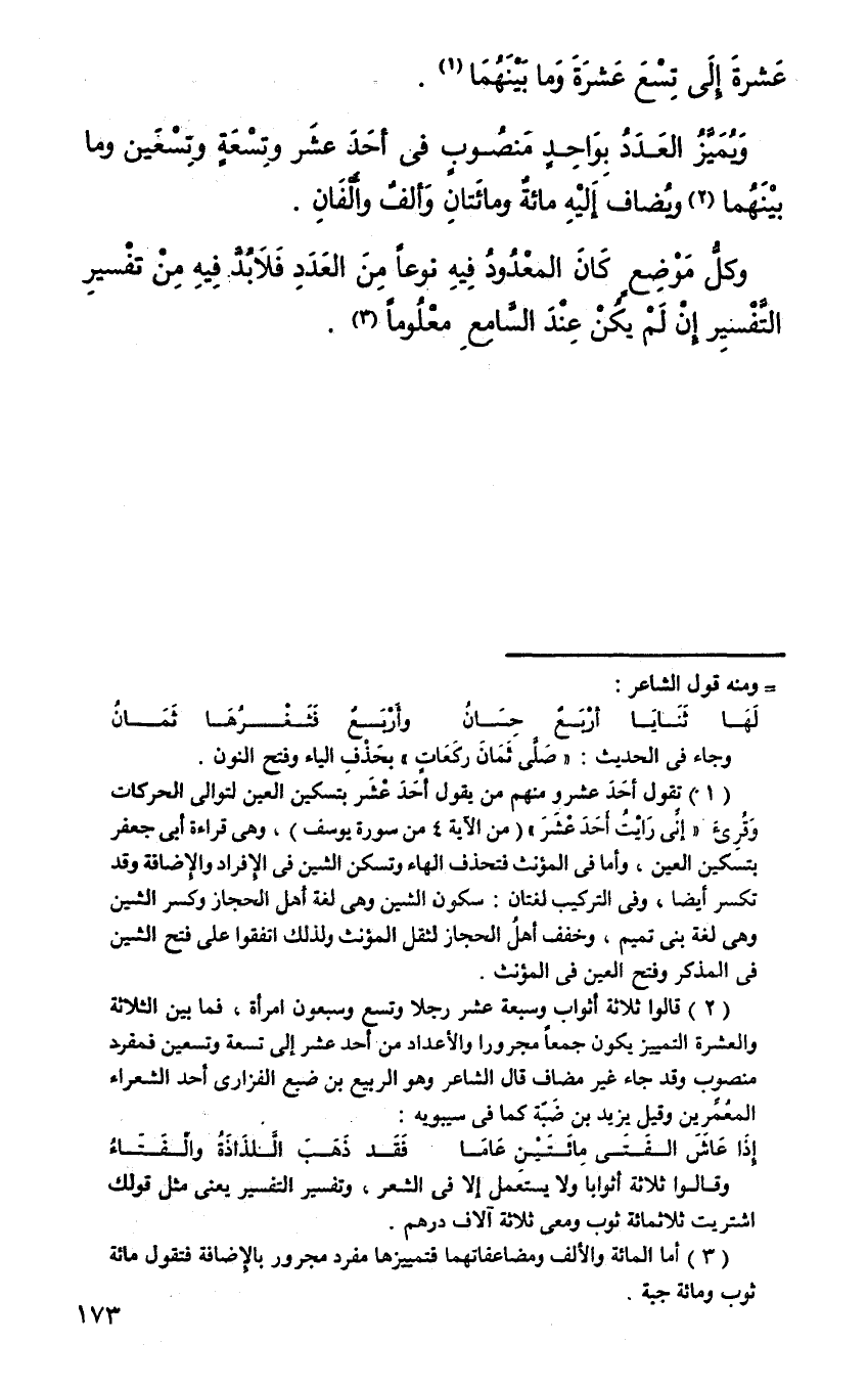 ويميز العدد بواحد منصوب في أحد عشر وتسعة وتسعين وما بينهما، ويضاف إليه مائة ومائتان وألف وألفان.