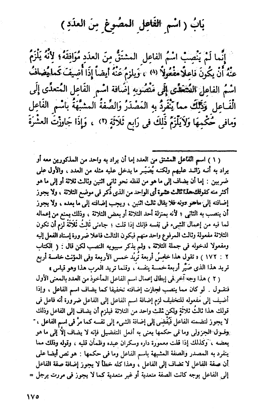 إنما لم يَنصِب اسمُ الفاعل المشتق من العدد موافِقَه لأنه يلزم عنه أن يكون فاعلا مفعولا، ويلزم عنه أيضا إذا أضيف كما يضاف اسم الفاعل المتعدي إلى منصوبة إضافة اسم الفاعل المتعدي إلى الفاعل، وذلك مما ينفرد به المصدر والصفة المشبهة باسم الفاعل وما في حكمها، ولا يلزم ذلك في رابع ثلاثة، وإذا جاوزت العشرة