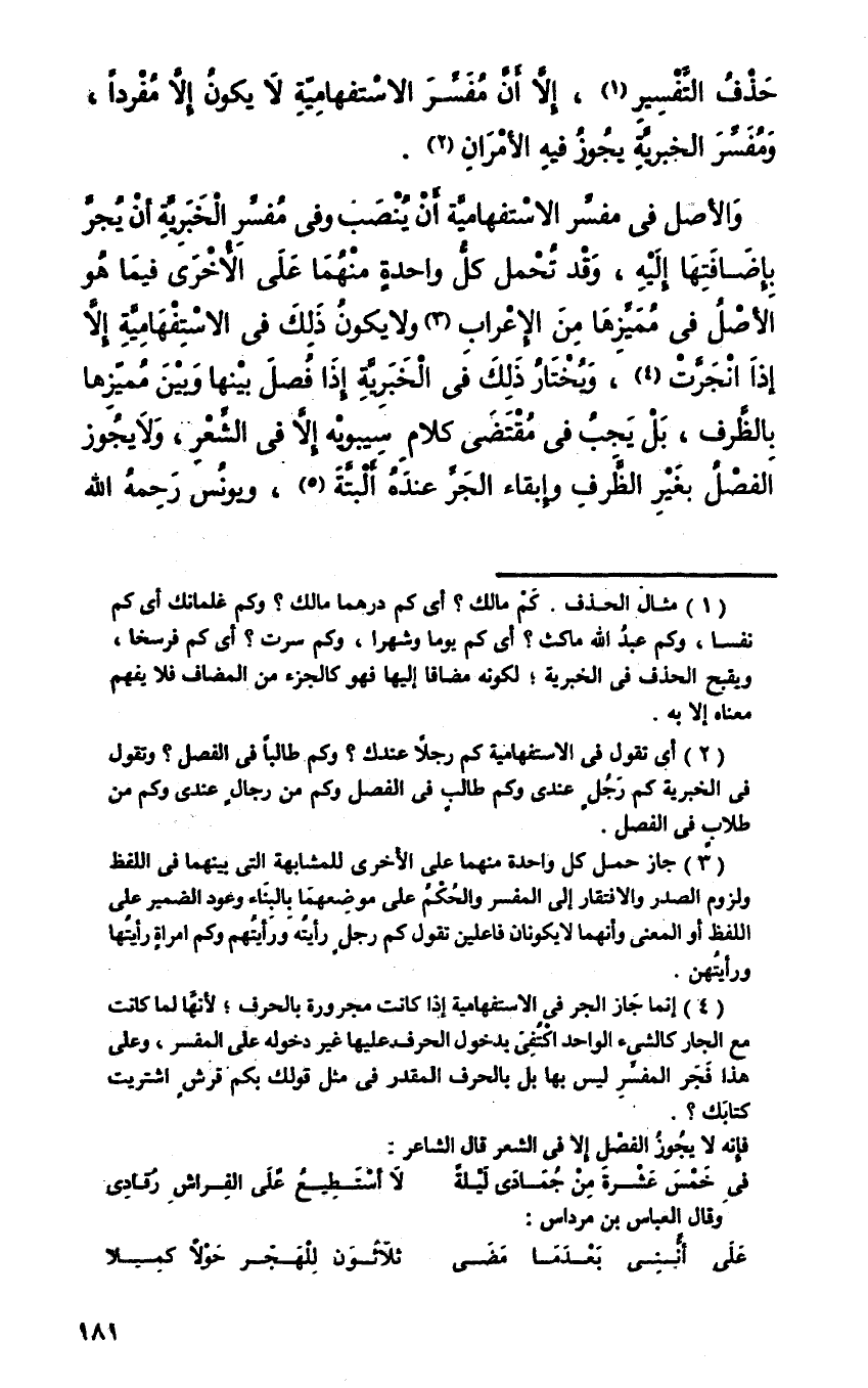 والأصل في مفسر الاستفهامية أن ينصب وفي مفسر الخبرية أن يجر بإضافتها إليه، وقد تحمل كل واحدة منهما على الأخرى فيما هو الأصل في مميزها من الإعراب، ولا يكون ذلك في الاستفهامية إلا إذا انجرت، ويختار ذلك في الخبرية إذا فصل بينها وبين مميزها بالظرف، بل يجب في مقتضى كلام سيبويه إلا في الشعر، ولا يجوز الفصل بغير الظرف وإبقاء الجر عنده البتة، ويونس رحمه الله