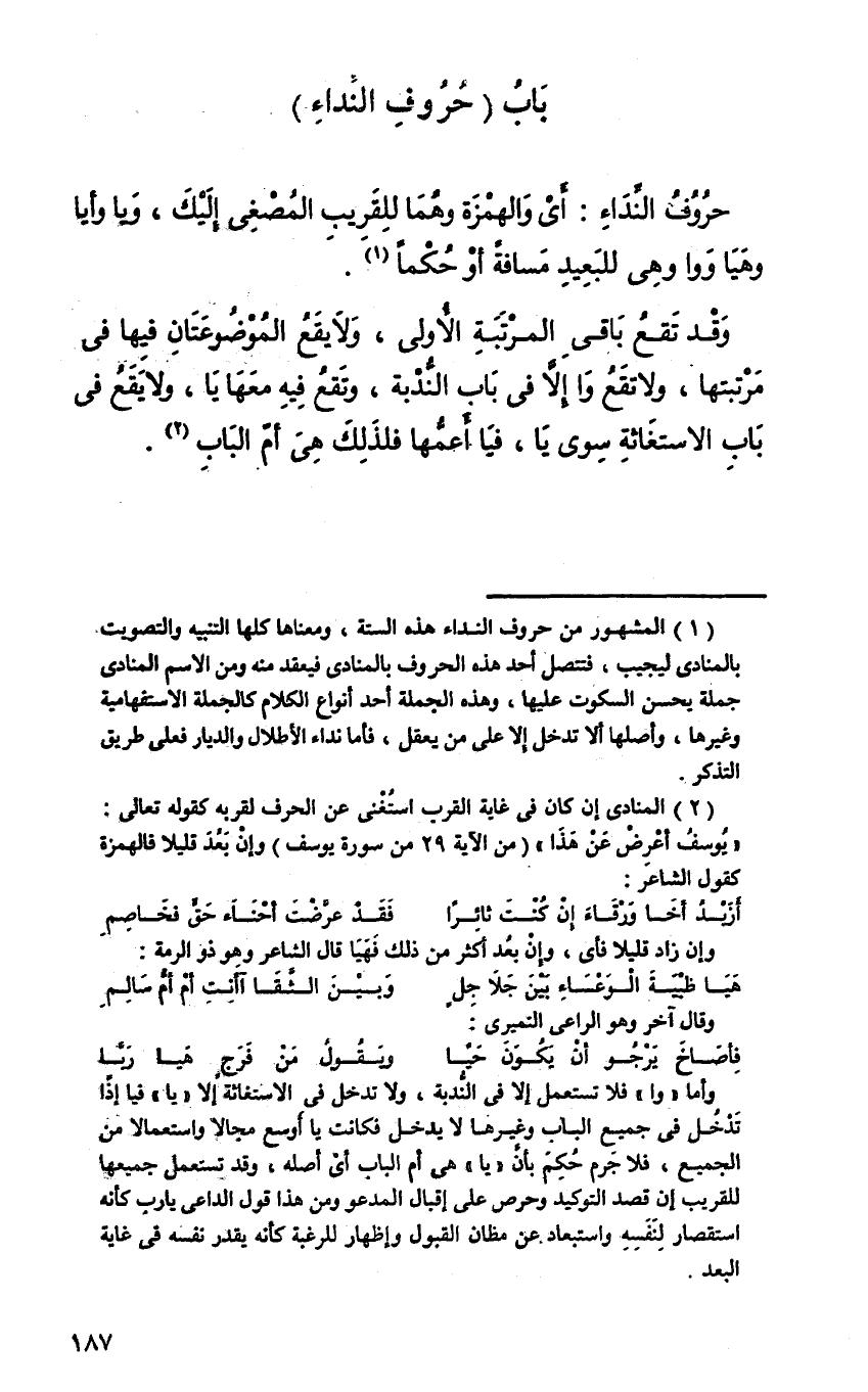 حروف النداء: أي والهمزة وهما للقريب المصغي إليك، ويا وأيا وهيا ووا وهي للبعيد مسافةً أو حكما.