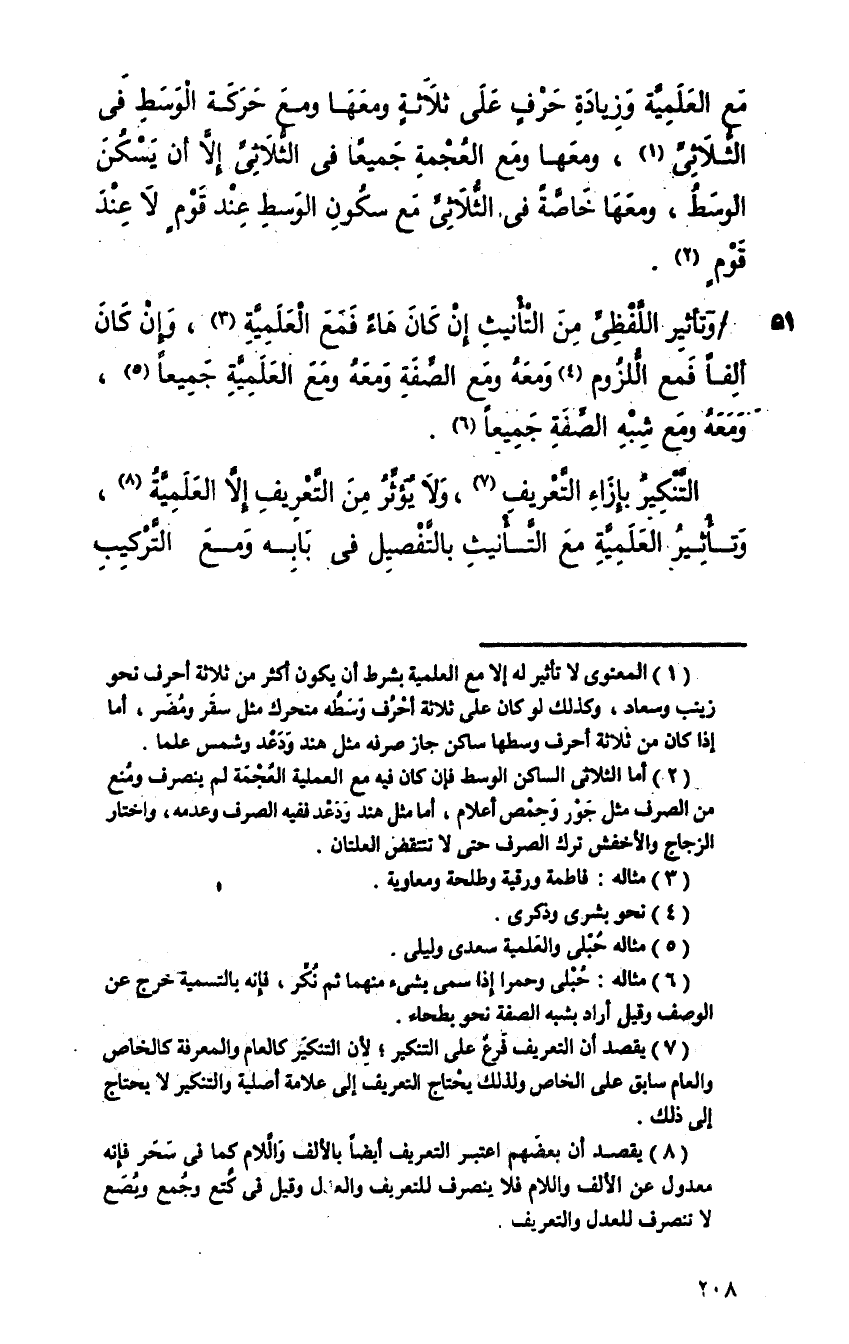 مع العلمية وزيادة حرف على ثلاثة ومعها ومع حركة الوسط في الثلاثي، ومعها ومع العجمة جميعا في الثلاثي إلا أن يسكن الوسط، ومعها خاصة في الثلاثي مع سكون الوسط عند قوم لا عند قوم.