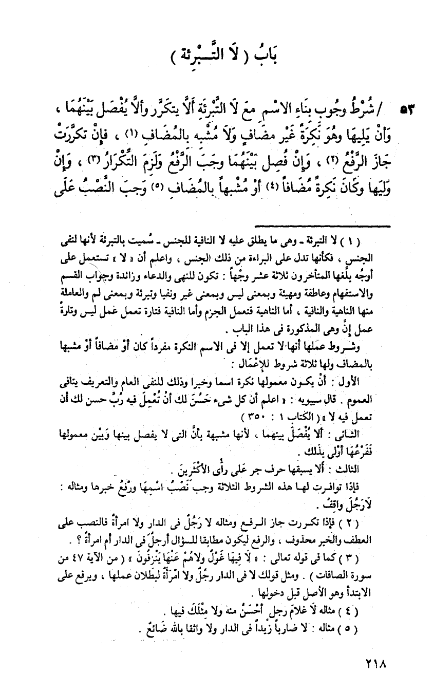 شَرْطُ وجوب بناء الاسم مع لا التبرئة: ألا يتكرر وألا يفصل بينهما، وأن يليها وهو نكرة غير مضاف ولا مشبه بالمضاف، فإن تكررت جاز الرفع، وإن فصل بينهما وجب الرفع ولزم التكرار، وإن وليها وكان نكرة مضافا أو مشبها بالمضاف وجب النصب على
