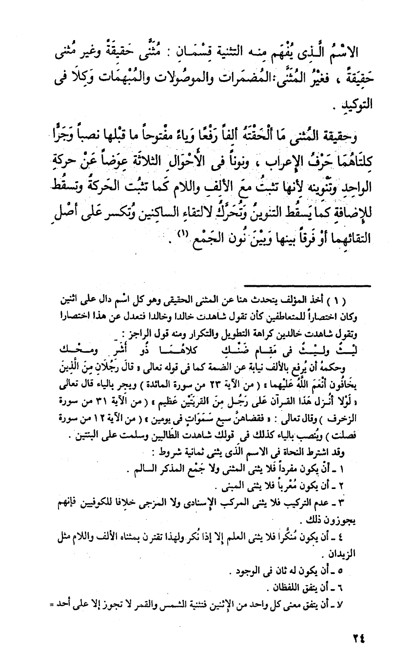 وحقيقة المثنى ما ألحقته ألفا رفعا وياء مفتوحا ما قبلها نصبا وجرا كلتاما حرف الإعراب، ونونا في الأحوال الثلاثة عوضا عن حركة الواحد وتنوينه لأنها تثبت مع الألف واللام كما تثبت الحركة وتسقط للإضافة كما يسقط التنوين وتحرك لالتقاء الساكنين وتكسر على أصل التقائهما أو فرقا بينها وبين نون الجمع.