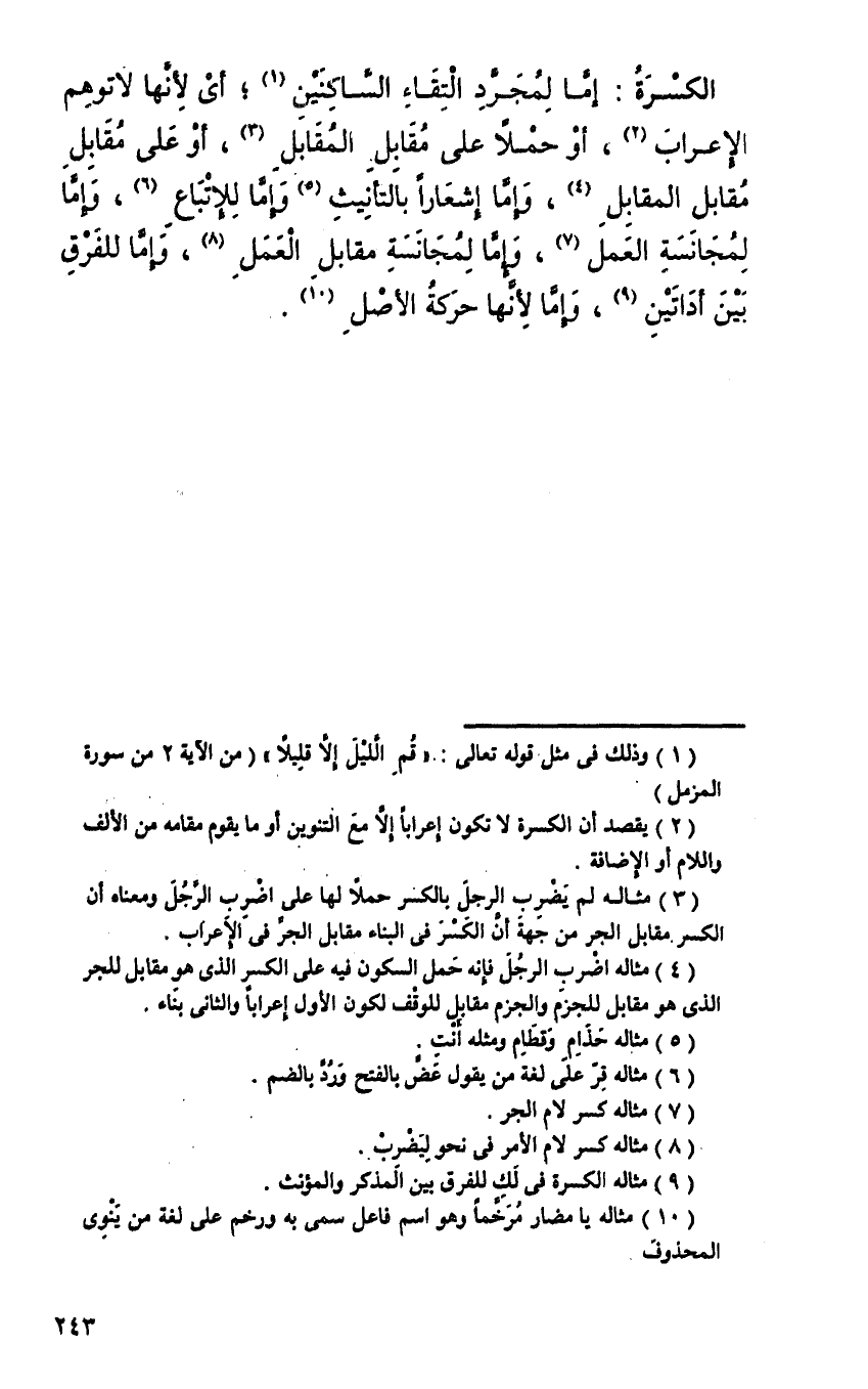 الكسرة: إما لمجرد التقاء الساكنين، أي لأنها لا توهم الإعراب، أو حملا على مقابل المقابل، أو على مقابل مقابل المقابل، وإما إشعارا بالتأنيث وإما للإتباع، وإما لمجانسة العمل، وإما لمجانسة مقابل العمل، وإما للفرق بين أداتين، وإما لأنها حركة الأصل.