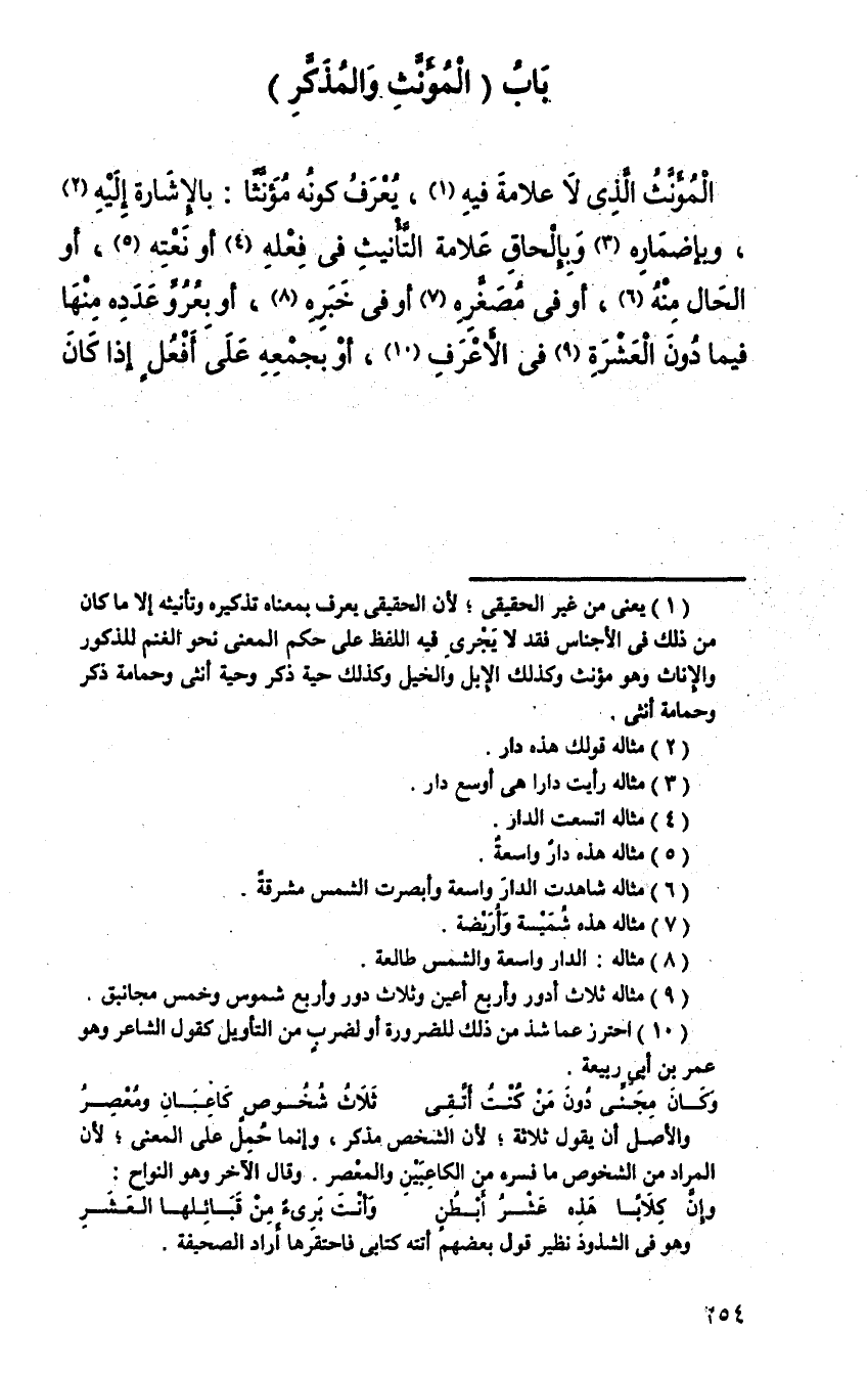 المؤنث الذي لا علامة فيه يعرف كونه مؤنثا: بالإشارة إليه، وبإضماره وبإلحاق علامة التأنيث في فعله أو نعته، أو الحال منه، أو في مصغره أو في خبره، أو بعُرُوِّ عدده منها فيما دون العشرة في الأعرف، أو بجمعه على أفعُل إذا كان