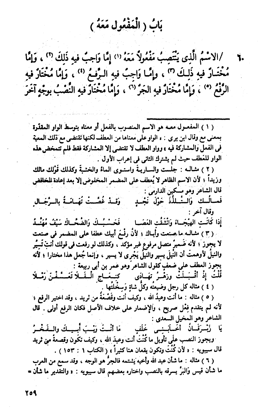 الاسم الذي ينتصب مفعولا معه إما واجب فيه ذلك، وإما مختار فيه ذلك، وإما واجب فيه الرفع، وإما مختار فيه الرفع، وإما مختار فيه الجر، وإما مختار فيه النصب بوجه آخر