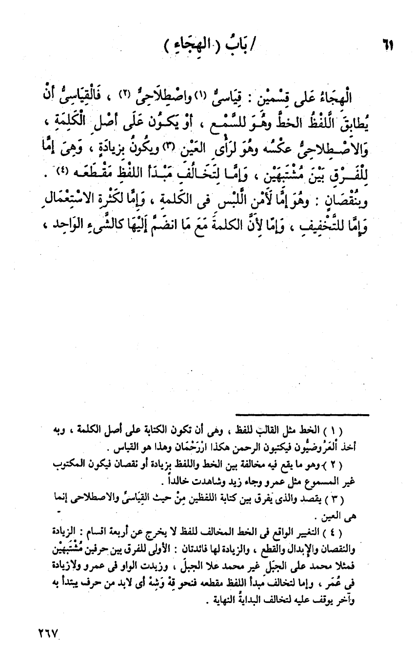الهجاء على قسمين: قياسي واصطلاحي، فالقياسي أن يطابق اللفظ الخط وهو للسمع، أو يكون على أصل الكلمة، والاصطلاحي عكسه وهو لرأي العين ويكون بزيادة وهي إما للفرق بين مشتبهين، وإما لتخالف مبدأ اللفظ مقطعه. وبنقصان: وهو إما لأمن اللبس في الكلمة، وإما لكثرة الاستعمال وإما للتخفيف، وإما لأن الكلمة مع ما انضم إليها كالشيء الواحد،