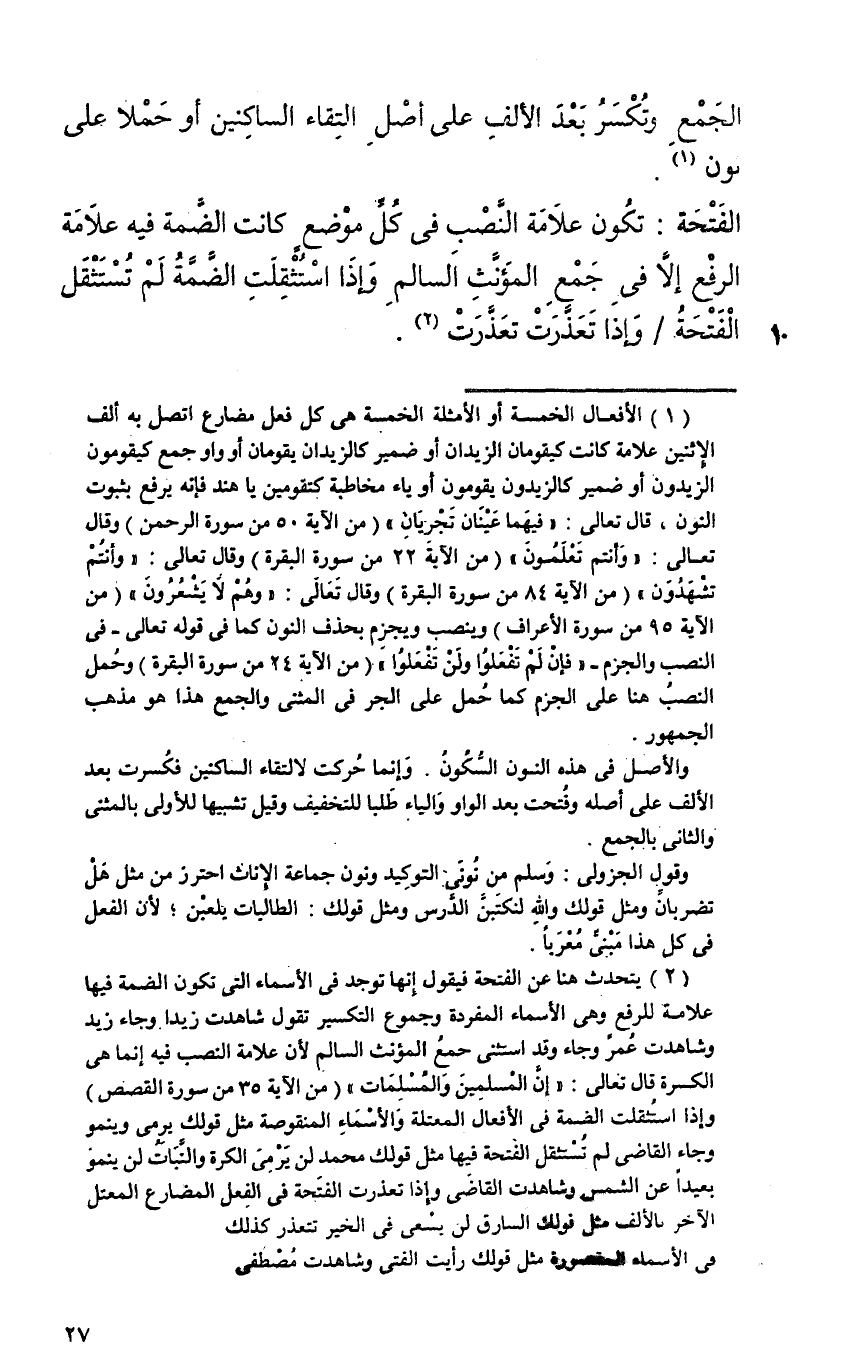 الفتحة: تكون علامة النصب في كل موضع كانت الضمة فيه علامة الرفع إلا في جمع المؤنث السالم، وإذا استثقلت الضمة لم تستثقل الفتحة وإذا تعذرت تعذرت.