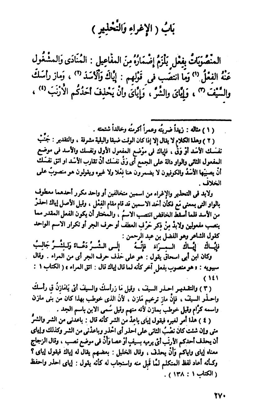 المنصوبات بفعل يلزم إضماره من المفاعيل: المنادى والمشغول عنه الفعل وما انتصب في قولهم: إياك والأسد، وماز رأسك والسيف، وإياي والشر، وإياي وأن يحذف أحدكم الأرنب،