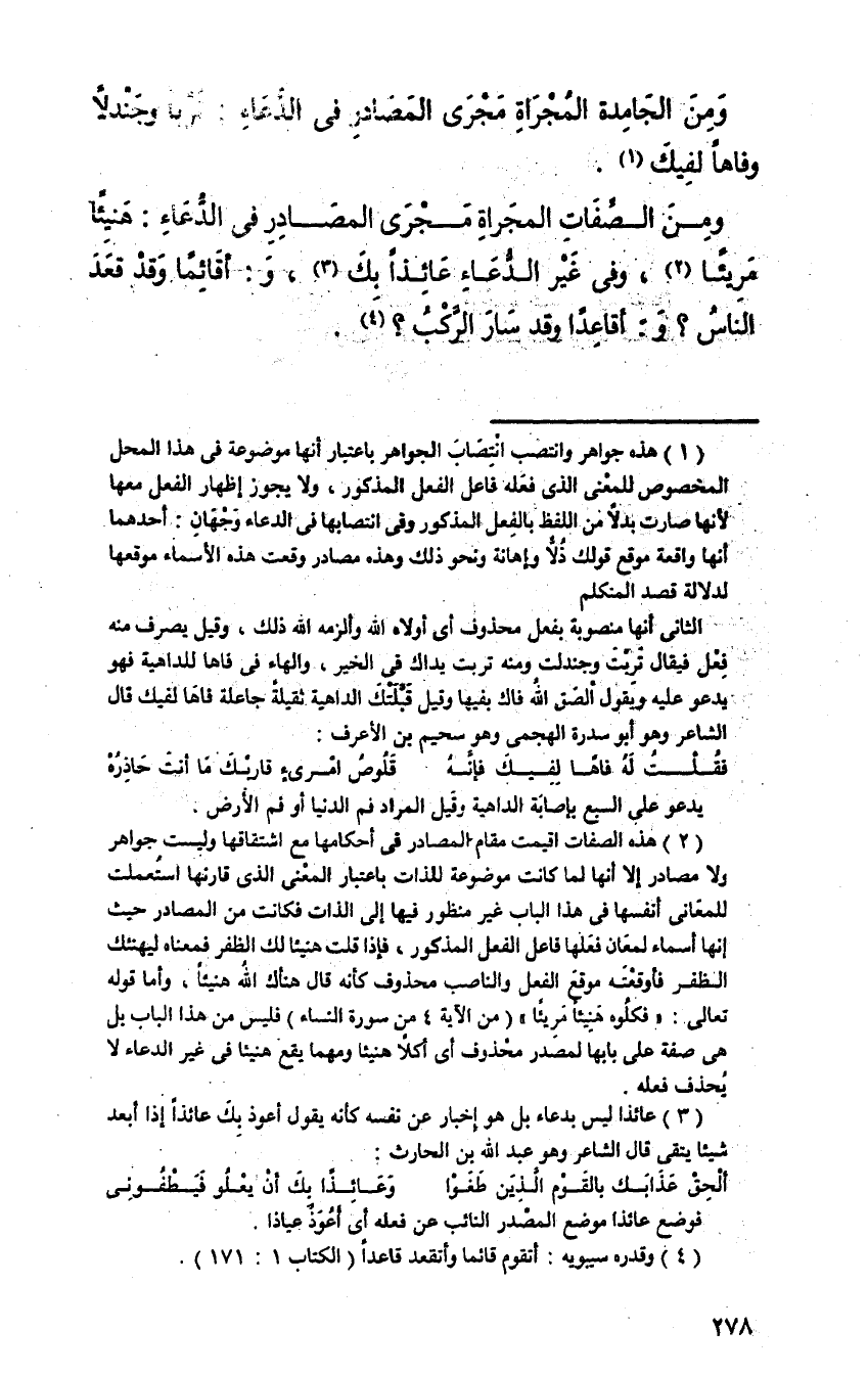 ومن الصفات المجراة مجرى المصادر في الدعاء: هنيئا مريئا، وفي غير الدعاء عائذا بك، و: أقائما وقد قعد الناس، و: أقاعدا وقد سار الركب؟
