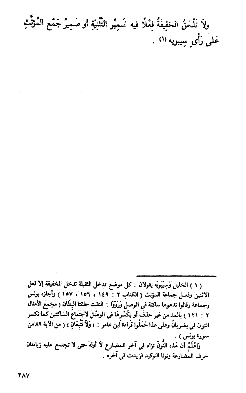 ولا تلحق الخفيفة فعلا فيه ضمير التثنية أو ضمير جمع المؤنث على رأي سيبويه.