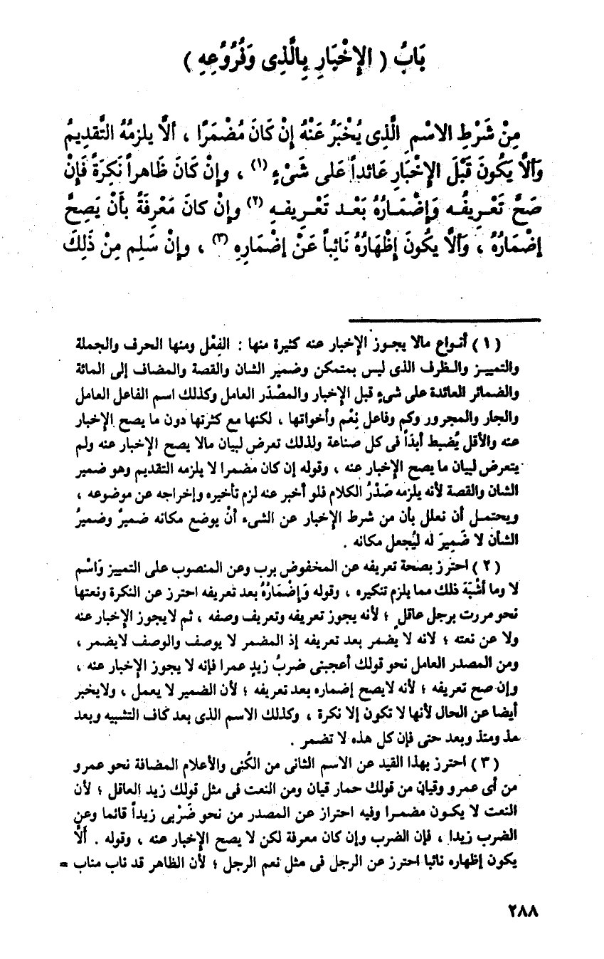 من شرط الاسم الذي يخبر عنه إن كان مضمرا، ألا يلزمه التقديم وألا يكون قبل الإخبار عائدا على شيء، وإن كان ظاهرا نكرة فإن صح تعريفه وإضماره بعد تعريفه وإن كان معرفة بأن يصح إضماره وألا يكون إظهاره نائبا عن إضماره، وإن سلم من ذلك