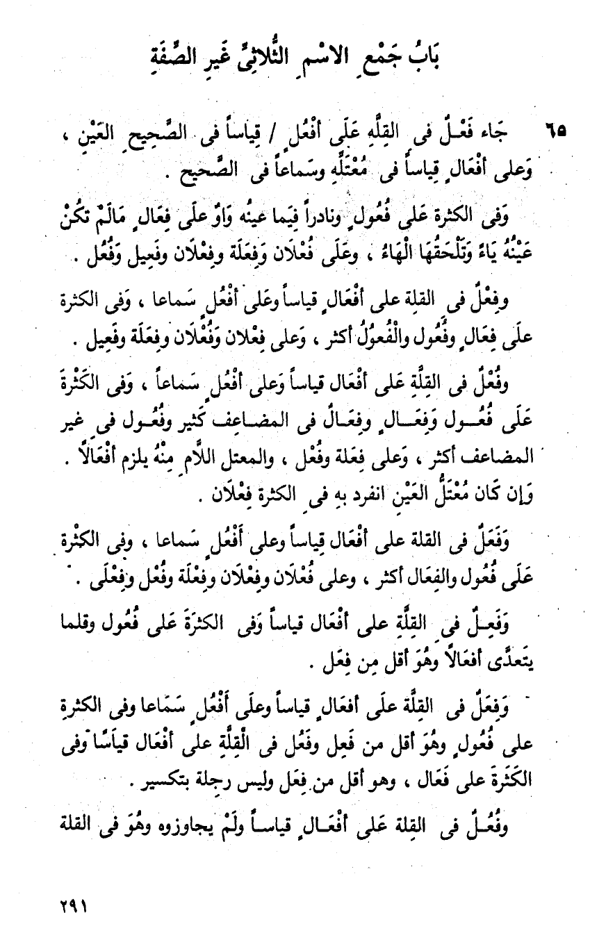وفُعْل في القلة على أفعال قياسا وعلى أفعُل سماعا، وفي الكثرة على فعول وفعال وفعال في المضاعف كثير وفعول في غير المضاعف أكثر، وعلى فِعَلة وفُعْل والمعتل اللام منه يلزم أفعالا.