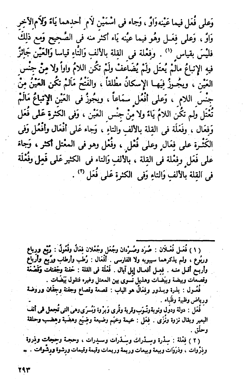 وعلى فُعَل فيما عينه واو، وجاء في اسمين لام أحدهما ياء ولام الآخر واو، وعلى فِعَل وهو فيما عينه ياء أكثر منه في الصحيح ومع ذلك فليس بقياس. وفِعْلة في القلة بالألف والتاء قياسا والعين جائز فيه الإتباع ما لم يعتل ولم يضاعف ولم تكن اللام واوا ولا من جنس العين، ويجوز فيها الإسكان مطلقا، والفتح ما لم تكن العين من جنس اللام، وعلى أفعُل سماعا، ويجوز في العين الإتباع ما لم تتعل ولم تكن اللام ياء ولا من جنس العين، وفي الكثرة على فُعَل وفعال وفَعَلة في القلة بالألف والتاء، وجاء على أفعال وأفعُل وفي الكثرة على فِعال وعلى فُعْل، وفُعْل وهو في المعتل أكثر، وجاء على فَعَل وفِعْلة في القلة، بالألف والتاء في الكثير على فَعِل وفُعْلة في القلة بالألف والتاء وفي الكثرة على فُعَل.