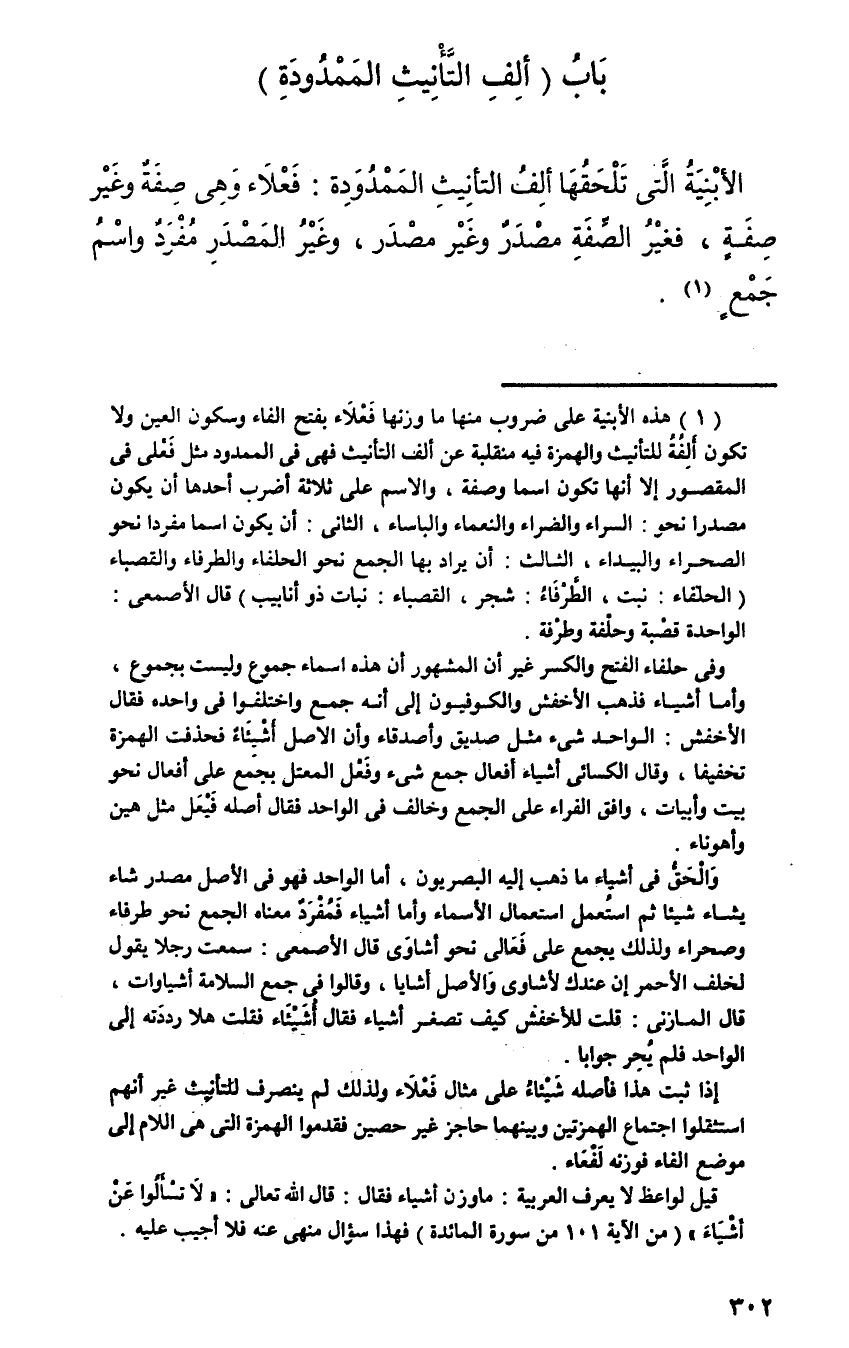 الأبنية التي تلحقها ألف التأنيث الممدودة: فَعْلاء وهي صفة وغير صفة، فغير الصفة مصدر وغير مصدر، وغير المصدر مفرد واسم جمع.