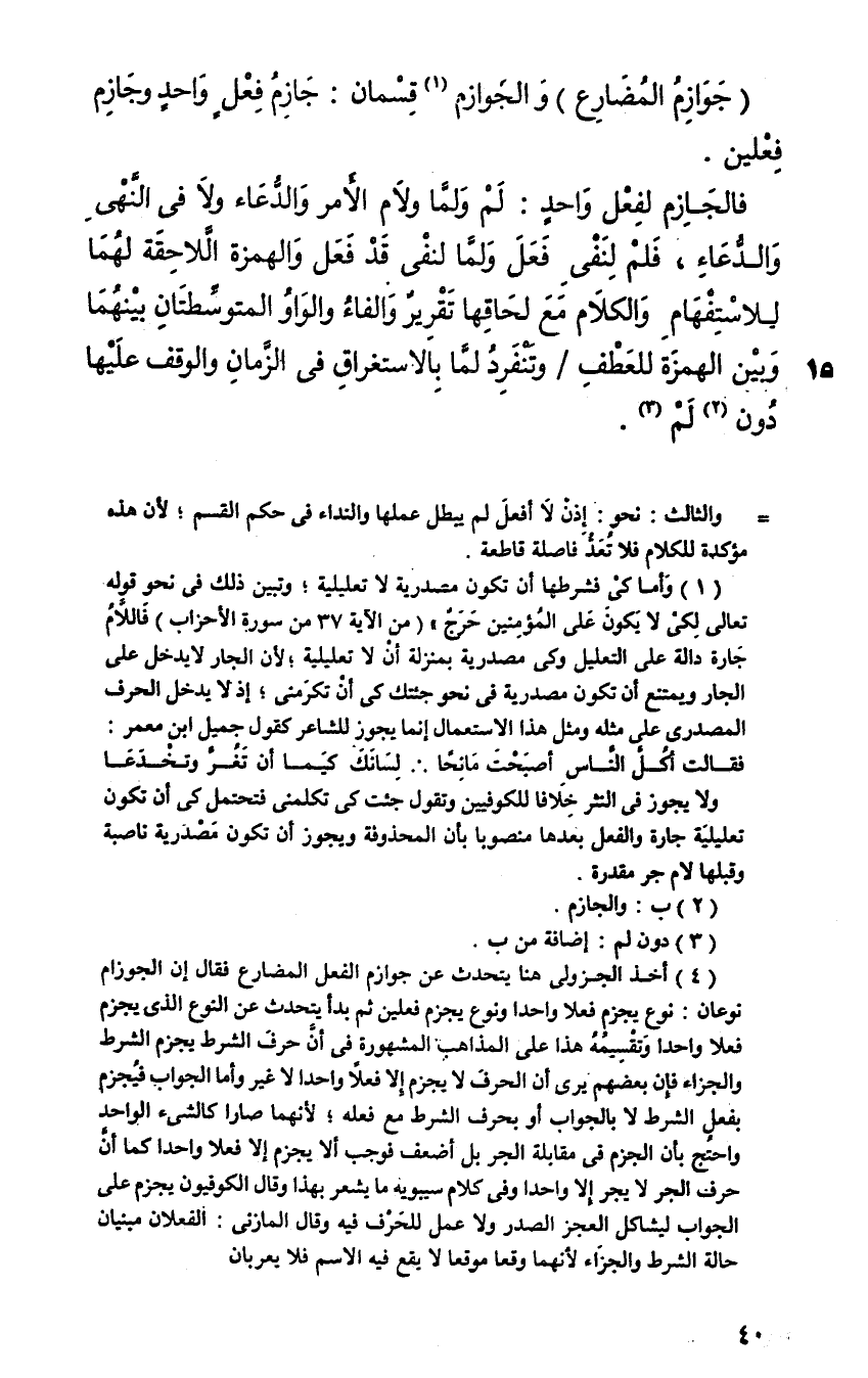 فالجازم لفعل واحد: لم ولما ولام الأمر والدعاء ولا في النهي والدعاء، فلم لنفي فعل ولما لنفي قد فعل والهمزة اللاحقة لهما للاستفهام والكلام مع لحاقها تقرير والفاء والواو المتوسطتان بينهما وبين الهمزة للعطف وتنفرد لما بالاستغراق في الزمان والوقف عليها دون لم.