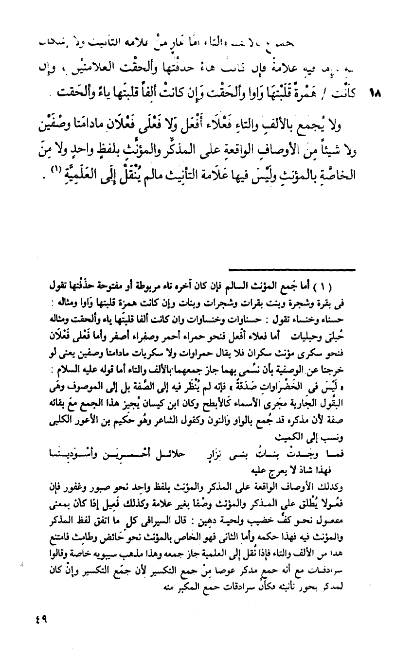 ولا يجمع بالألف والتاء فعلاء أفعل ولا فعلى فعلان ما دامتا وصفين ولا شيئا من الأوصاف الواقعة على المذكر والمؤنث بلفظ واحد ولا من الخاصة بالمؤنث وليس فيها علامة التأنيث ما لم ينقل إلى العلمية.
