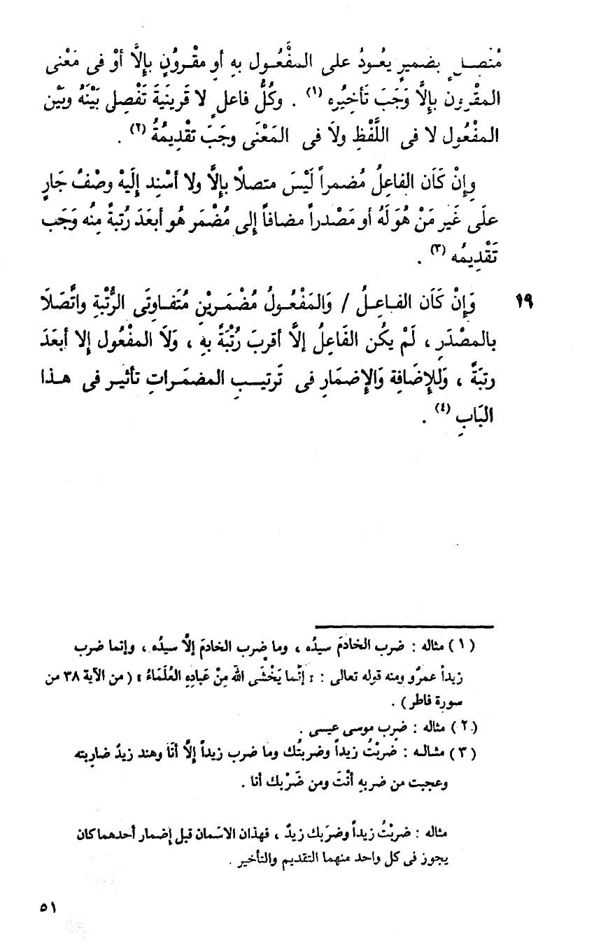 متصل بضمير يعود على المفعول به أو مقرون بإلا أو في معنى المقرون بإلا وجب تأخيره. وكل فاعل لا قرينية [قرينة] تفصل بينه وبين المفعول لا في اللفظ ولا في المعنى وجب تقديمه.