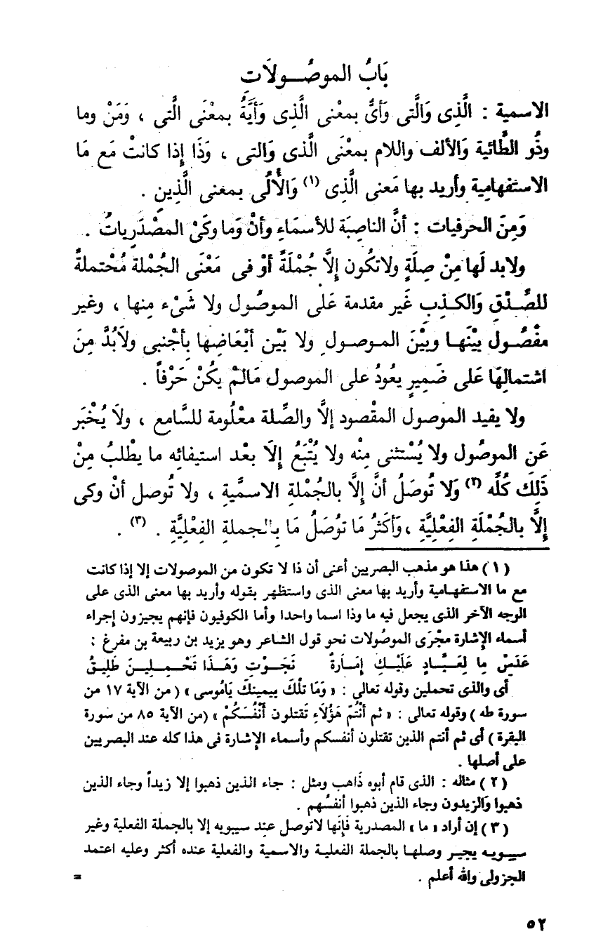 ولا بد لها من صلة ولا تكون إلا جملة أو في معنى الجملة محتملة للصدق والكذب غير مقدمة على الموصول ولا شيء منها، وغير مفصول بينها وبين الموصول ولا بين أبعاضها بأجنبي، ولا بد من اشتمالها على ضمير يعود على الموصول ما لم يكن حرفا.