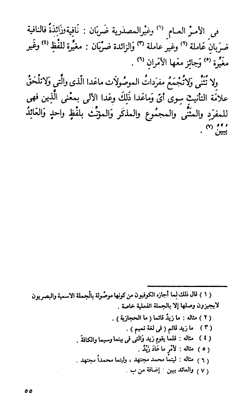 ولا تثنى ولا تجمع مفردات الموصولات ما عدا الذي والتي ولا تلحق علامة التأنيث سوى أي وما عدا ذلك وعدا الألى بمعنى الذين فهي للمفرد والمثنى والمجموع والمذكر والمؤنث بلفظ واحد والعائد يبين.