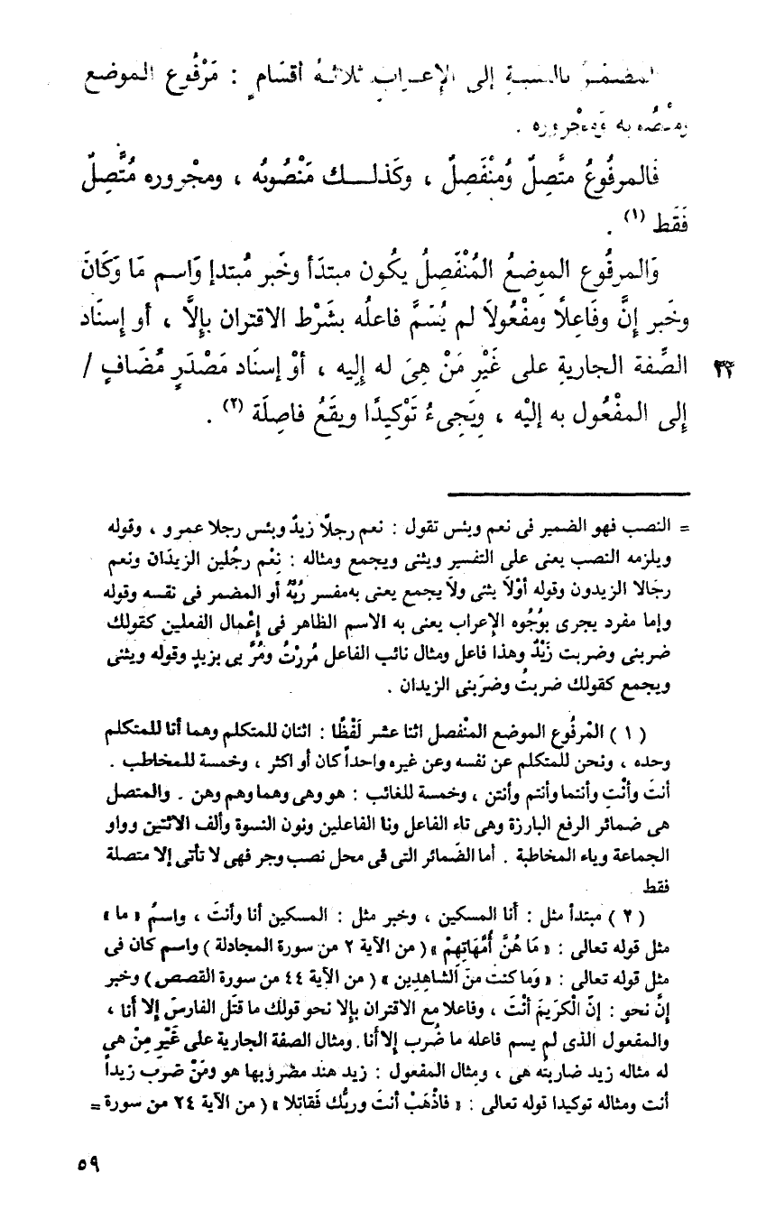 والمرفوع الموضع المنفصل يكون مبتدأ وخبر مبتدأ واسم ما وكان وخبر إن وفاعلا ومفعولا لم يسم فاعله بشرط الاقتران بإلا أو إسناد الصفة الجارية على غير من هي له إليه، أو إسناد مصدر مضاف إلى المفعول به إليه، ويجيء توكيدا ويقع فاصلة.