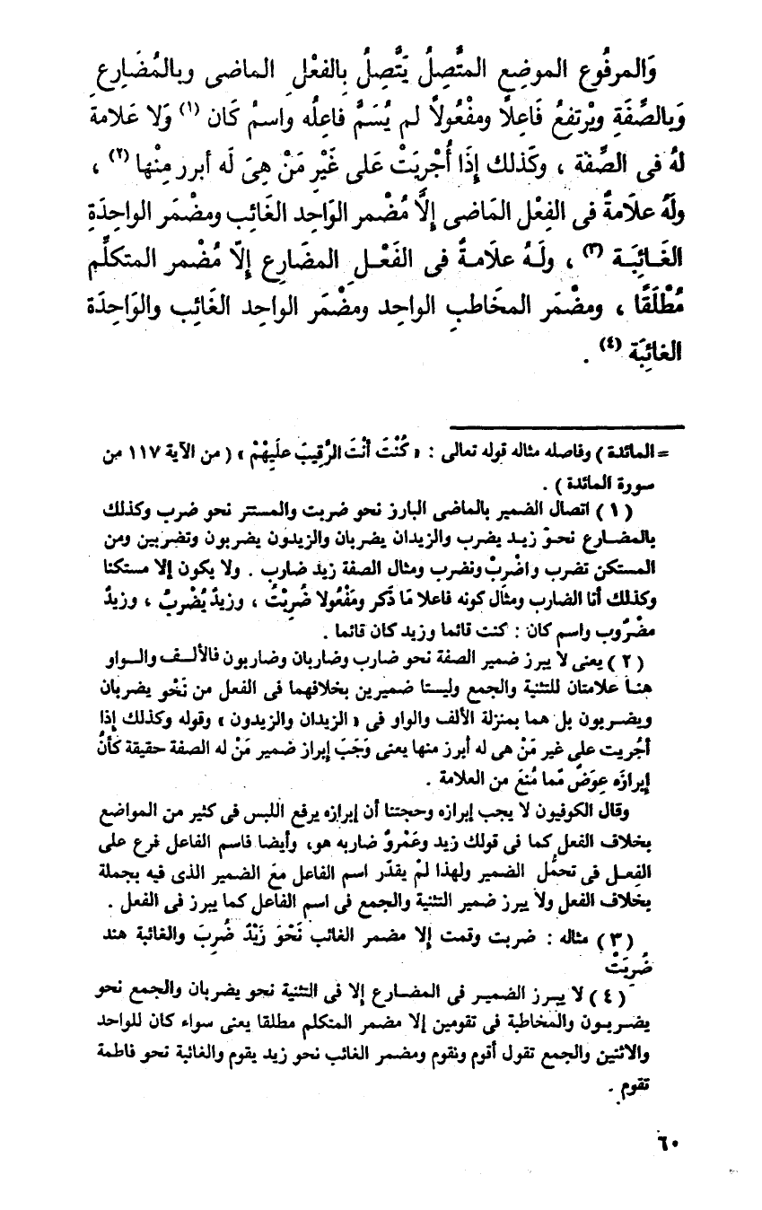 والمرفوع الموضع المتصل يتصل بالفعل الماضي وبالمضارع وبالصفة ويرتفع فاعلا ومفعولا لم يسم فاعله واسم كان ولا علامة له في الصفة، وكذلك إذا أجريت على غير من هي له أبرز منها، وله علامة في الفعل الماضي إلا مضمر الواحد الغائب ومضمر الواحدة الغائبة، وله علامة في الفعل المضارع إلا مضمر المتكلم مطلقا، ومضمر المخاطب الواحد ومضمر الواحد الغائب والواحدة الغائبة.