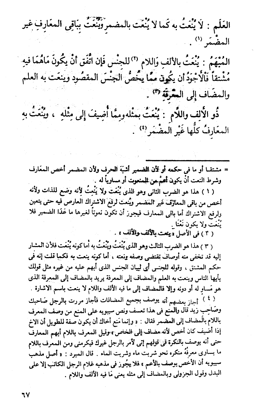 المبهم: ينعت بالألف واللام للجنس فإن اتفق أن يكون ما هما فيه مشتقا فالأجود أن يكون مما يخص الجنس المقصود وينعت به العلم والمضاف إلى المعرفة.