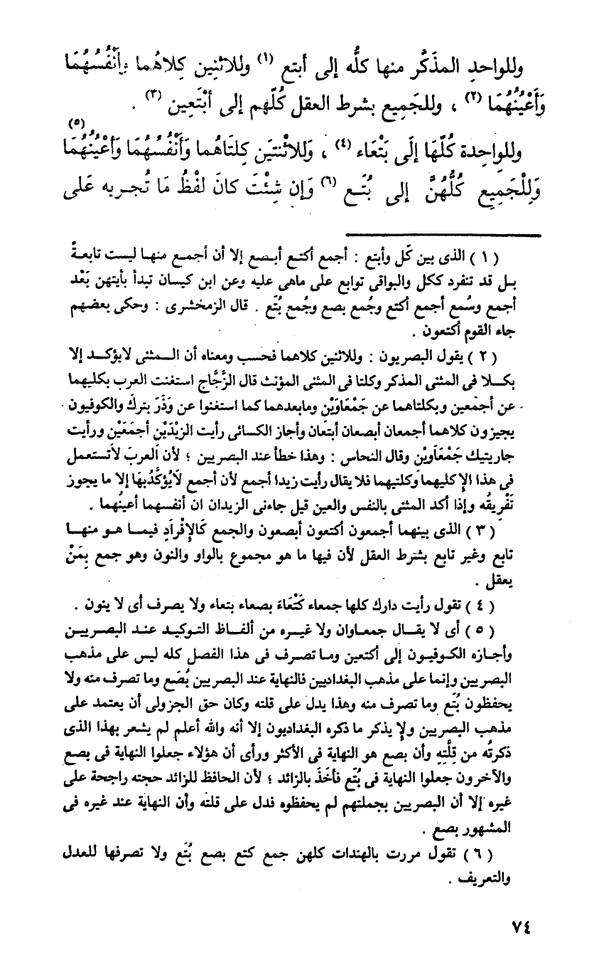 وللواحد المذكر منها كله إلى أبتع وللاثنين كلاهما وأنفسهما وأعينهما، وللجميع بشرط العقل كلهم إلى أبتعين.