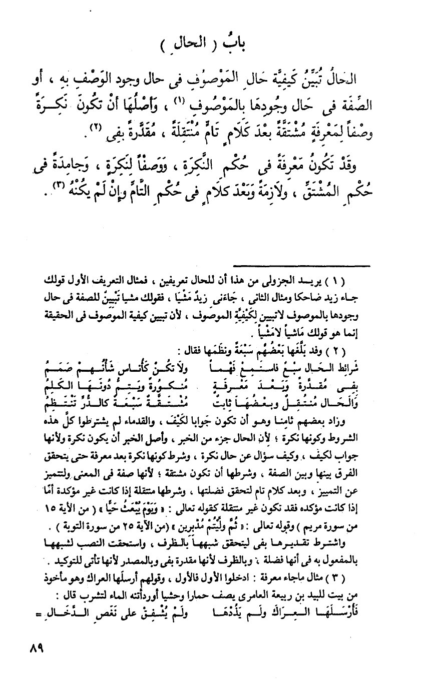 الحال تبين كيفية حال الموصوف في حال وجود الوصف به، أو الصفة في حال وجودها بالموصوف، وأصلها أن تكون نكرة وصفا لمعرفة مشتقة بعد كلام تام منتقلة، مقدرة بفي.