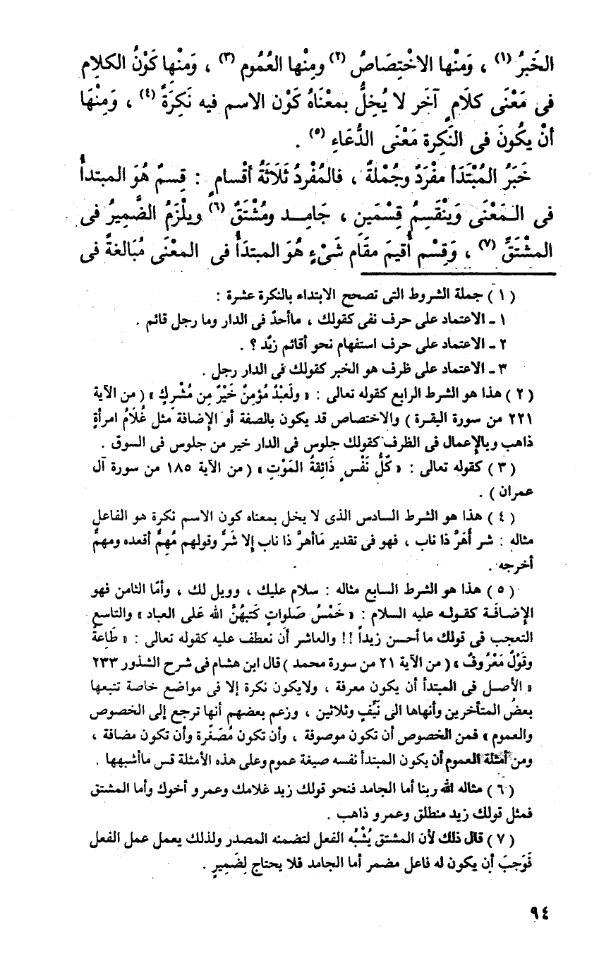 الخبر، ومنها الاختصاص ومنها العموم، ومنها كون الكلام في معنى كلام آخر لا يخل بمعناه كون الاسم فيه نكرة، ومنها أن يكون في النكرة معنى الدعاء.