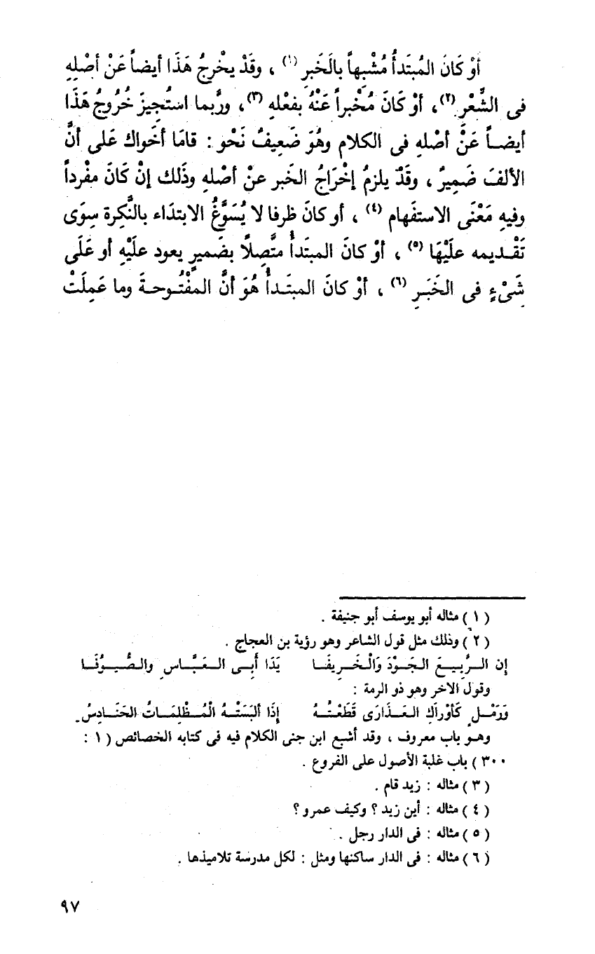 أو كان المبتدأ مشبها بالخبر، وقد يخرج هذا أيضا عن أصله في الشعر، أو كان مخبرا عنه بفعله، وربما استجيز خروج هذا أيضا عن أصله في الكلام وهو ضعيف نحو: قاما أخواك على أن الألف ضمير، وقد يلزم إخراج الخبر عن أصله وذلك إن كان مفردا وفيه معنى الاستفهام، أو كان ظرفا لا يسوغ الابتداء بالنكرة سوى تقديمه عليها، أو كان المبتدأ متصلا بضمير يعود عليه أو على شيء في الخبر، أو كان المبتدأ هو أن المفتوحة وما عملت