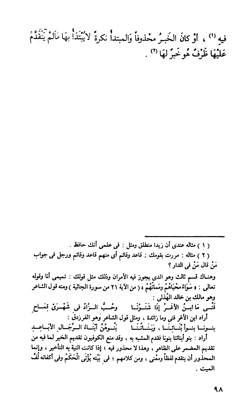 فيه، أو كان الخبر محذوفا والمبتدأ نكرة لا يبتدأ بها ما لم يتقدم عليها ظرف هو خبر لها.