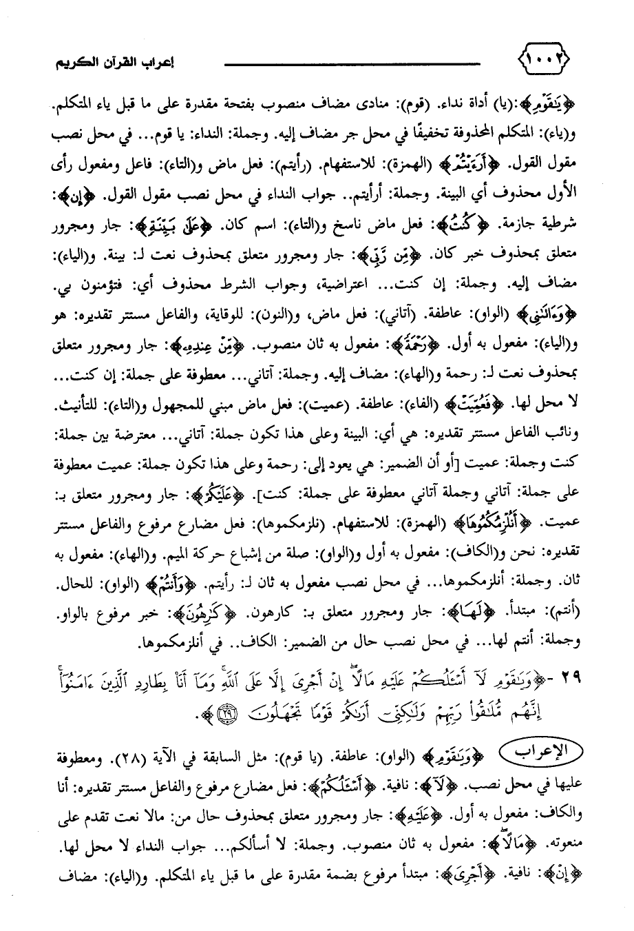 الإعراب {وَيا قَوْمِ} (الواو): عاطفة. (يا قوم): مثل السابقة في الآية (٢٨).ومعطوفة عليها في محل نصب. {لا}: نافية. {أَسْئَلُكُمْ}: فعل مضارع مرفوع والفاعل مستتر تقديره: أنا والكاف: مفعول به أول. {عَلَيْهِ}: جار ومجرور متعلق بمحذوف حال من: مالا نعت تقدم على منعوته. {مالاً}: مفعول به ثان منصوب. وجملة: لا أسألكم ... جواب النداء لا محل لها.