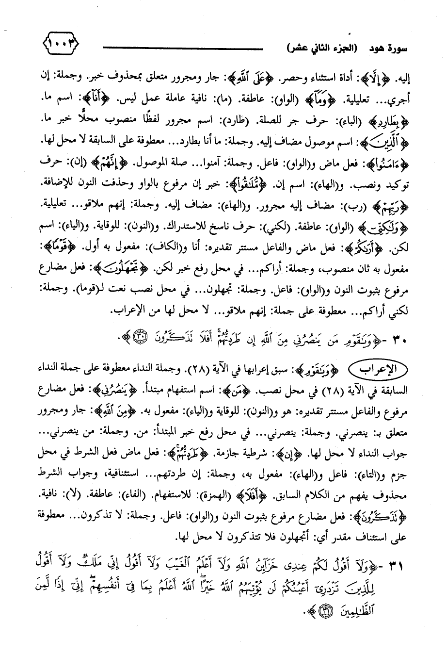الإعراب {وَيا قَوْمِ}: سبق إعرابها في الآية (٢٨).وجملة النداء معطوفة على جملة النداء السابقة في الآية (٢٨) في محل نصب. {مَنْ}: اسم استفهام مبتدأ. {يَنْصُرُنِي}: فعل مضارع مرفوع والفاعل مستتر تقديره: هو و (النون): للوقاية و (الياء): مفعول به. {مِنَ اللهِ}: جار ومجرور متعلق ب: ينصرني. وجملة: ينصرني ... في محل رفع خبر المبتدأ: من. وجملة: من ينصرني