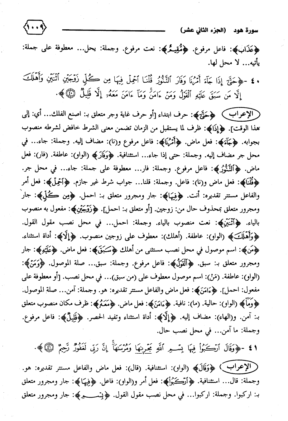 الإعراب {حَتّى}: حرف ابتداء [أو حرف غاية وجر متعلق ب: اصنع الفلك ... أي: إلى هذا الوقت]. {إِذا}: ظرف لما يستقبل من الزمان تضمن معنى الشرط خافض لشرطه منصوب بجوابه. {جاءَ}: فعل ماض. {أَمْرُنا}: فاعل مرفوع و (نا): مضاف إليه. وجملة: جاء ... في محل جر مضاف إليه. وجملة: حتى إذا جاء ... استئنافية. {وَفارَ} (الواو): عاطفة. (فار): فعل ماض. {التَّنُّورُ}: فاعل مرفوع. وجملة: فار ... معطوفة على جملة: جاء ... في محل جر.