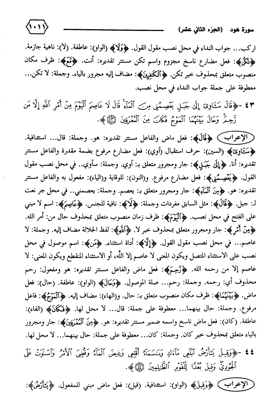 {سَآوِي} (السين): حرف استقبال (آوي): فعل مضارع مرفوع بضمة مقدرة والفاعل مستتر تقديره: أنا. {إِلى جَبَلٍ}: جار ومجرور متعلق ب: آوي. وجملة: سآوي ... في محل نصب مقول القول. {يَعْصِمُنِي}: فعل مضارع مرفوع. و (النون): للوقاية و (الياء): مفعول به والفاعل مستتر تقديره: هو. {مِنَ الْماءِ}: جار ومجرور متعلق ب: يعصم. وجملة: يعصمني ... في محل جر نعت ل: جبل. {قالَ}: مثل السابق مفردات وجملة: {لا}: نافية للجنس. {عاصِمَ}: اسم لا مبني على الفتح في محل نصب. {الْيَوْمَ}: ظرف زمان منصوب متعلق بمحذوف حال من: أمر الله.