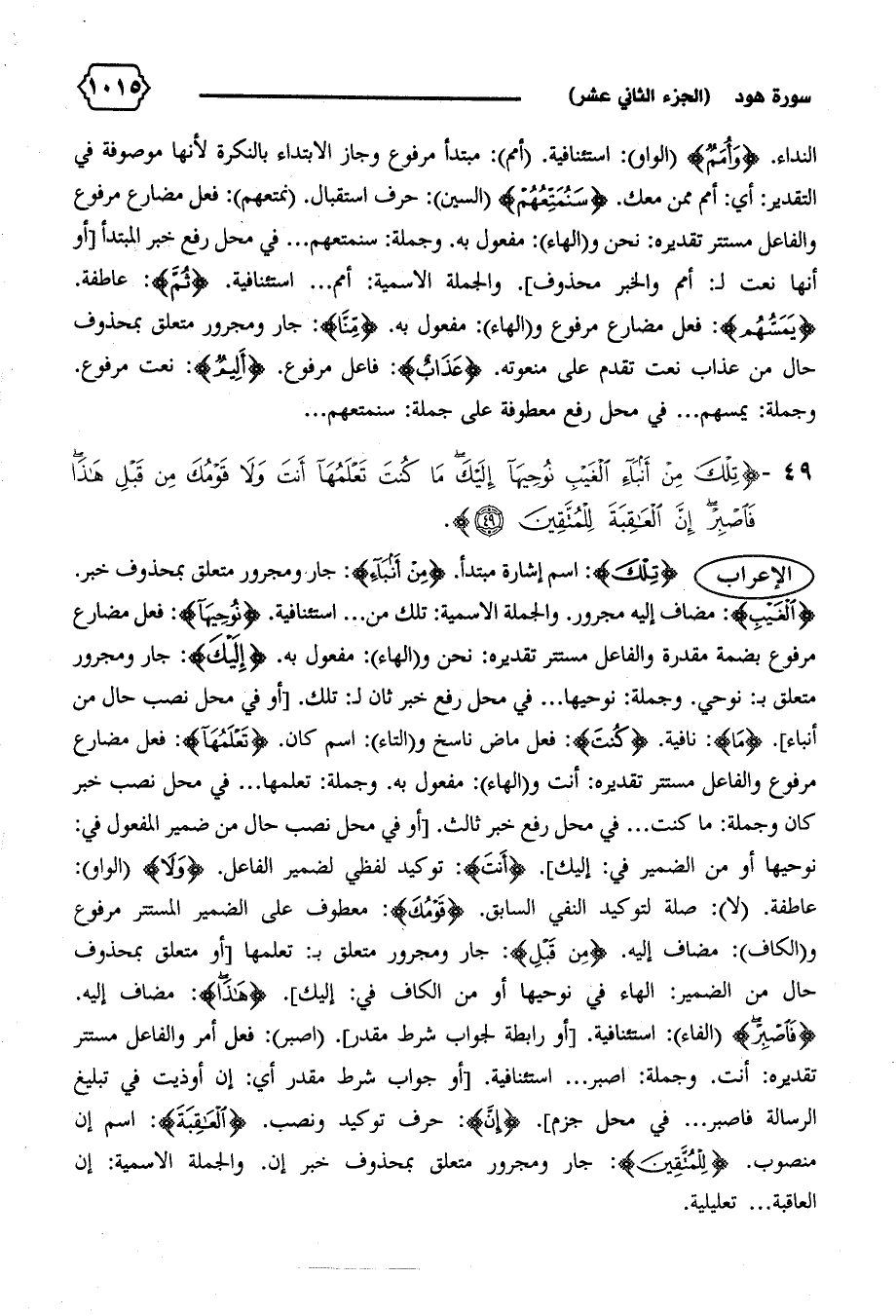{الْغَيْبِ}: مضاف إليه مجرور. والجملة الاسمية: تلك من ... استئنافية. {نُوحِيها}: فعل مضارع مرفوع بضمة مقدرة والفاعل مستتر تقديره: نحن و (الهاء): مفعول به. {إِلَيْكَ}: جار ومجرور متعلق ب: نوحي. وجملة: نوحيها ... في محل رفع خبر ثان ل: تلك. [أو في محل نصب حال من أنباء]. {ما}: نافية. {كُنْتَ}: فعل ماض ناسخ و (التاء): اسم كان. {تَعْلَمُها}: فعل مضارع مرفوع والفاعل مستتر تقديره: أنت و (الهاء): مفعول به. وجملة: تعلمها ... في محل نصب خبر كان وجملة: ما كنت ... في محل رفع خبر ثالث. [أو في محل نصب حال من ضمير المفعول في: