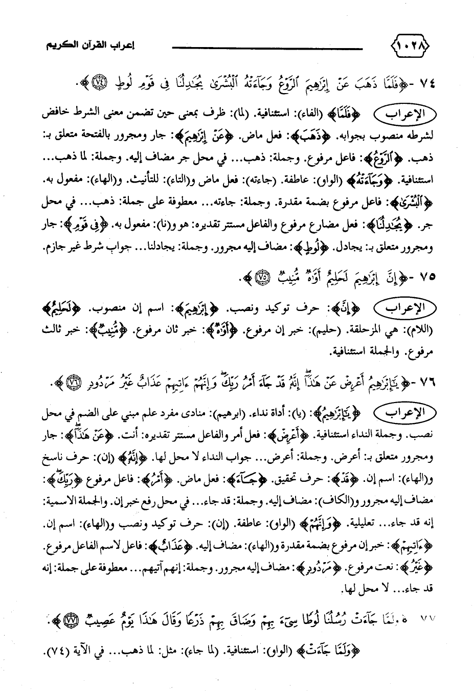 {الْبُشْرى}: فاعل مرفوع بضمة مقدرة. وجملة: جاءته ... معطوفة على جملة: ذهب ... في محل جر. {يُجادِلُنا}: فعل مضارع مرفوع والفاعل مستتر تقديره: هو و (نا): مفعول به. {فِي قَوْمِ}: جار ومجرور متعلق ب: يجادل. {لُوطٍ}: مضاف إليه مجرور. وجملة: يجادلنا ... جواب شرط غير جازم.