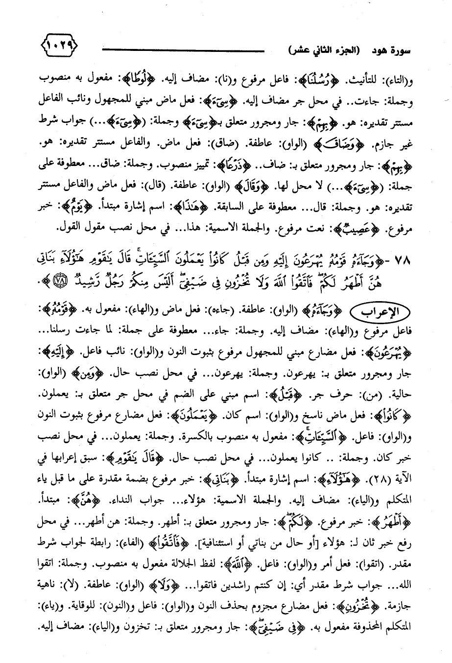 {كانُوا}: فعل ماض ناسخ و (الواو): اسم كان. {يَعْمَلُونَ}: فعل مضارع مرفوع بثبوت النون و (الواو): فاعل. {السَّيِّئاتِ}: مفعول به منصوب بالكسرة. وجملة: يعملون ... في محل نصب خبر كان. وجملة: ... كانوا يعملون ... في محل نصب حال. {قالَ يا قَوْمِ}: سبق إعرابها في الآية (٢٨). {هؤُلاءِ}: اسم إشارة مبتدأ. {بَناتِي}: خبر مرفوع بضمة مقدرة على ما قبل ياء المتكلم و (الياء): مضاف إليه. والجملة الاسمية: هؤلاء ... جواب النداء. {هُنَّ}: مبتدأ.