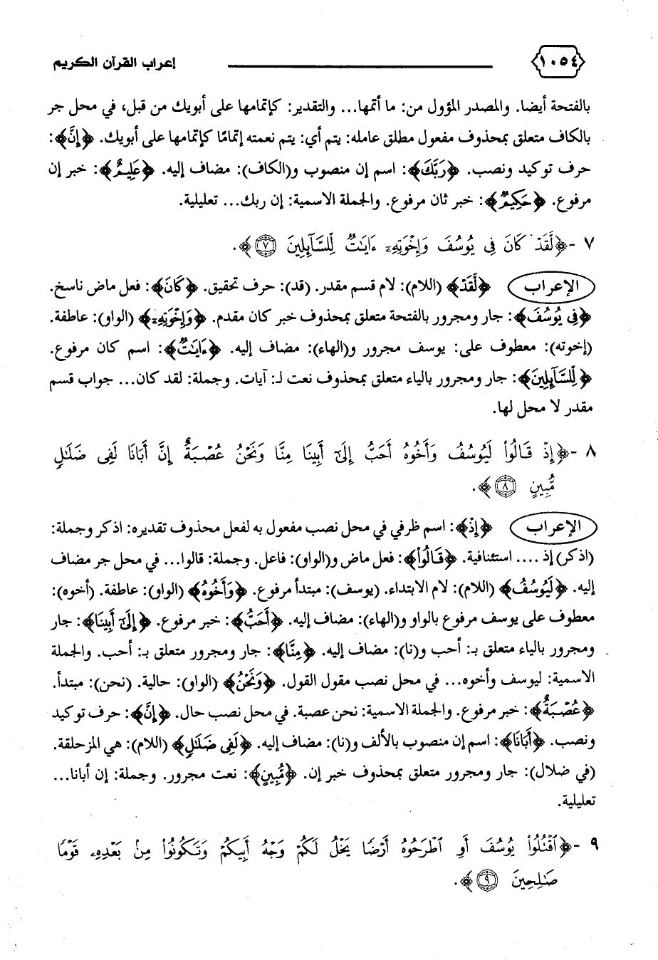 {لِلسّائِلِينَ}: جار ومجرور بالياء متعلق بمحذوف نعت ل: آيات. وجملة: لقد كان ... جواب قسم مقدر لا محل لها.
