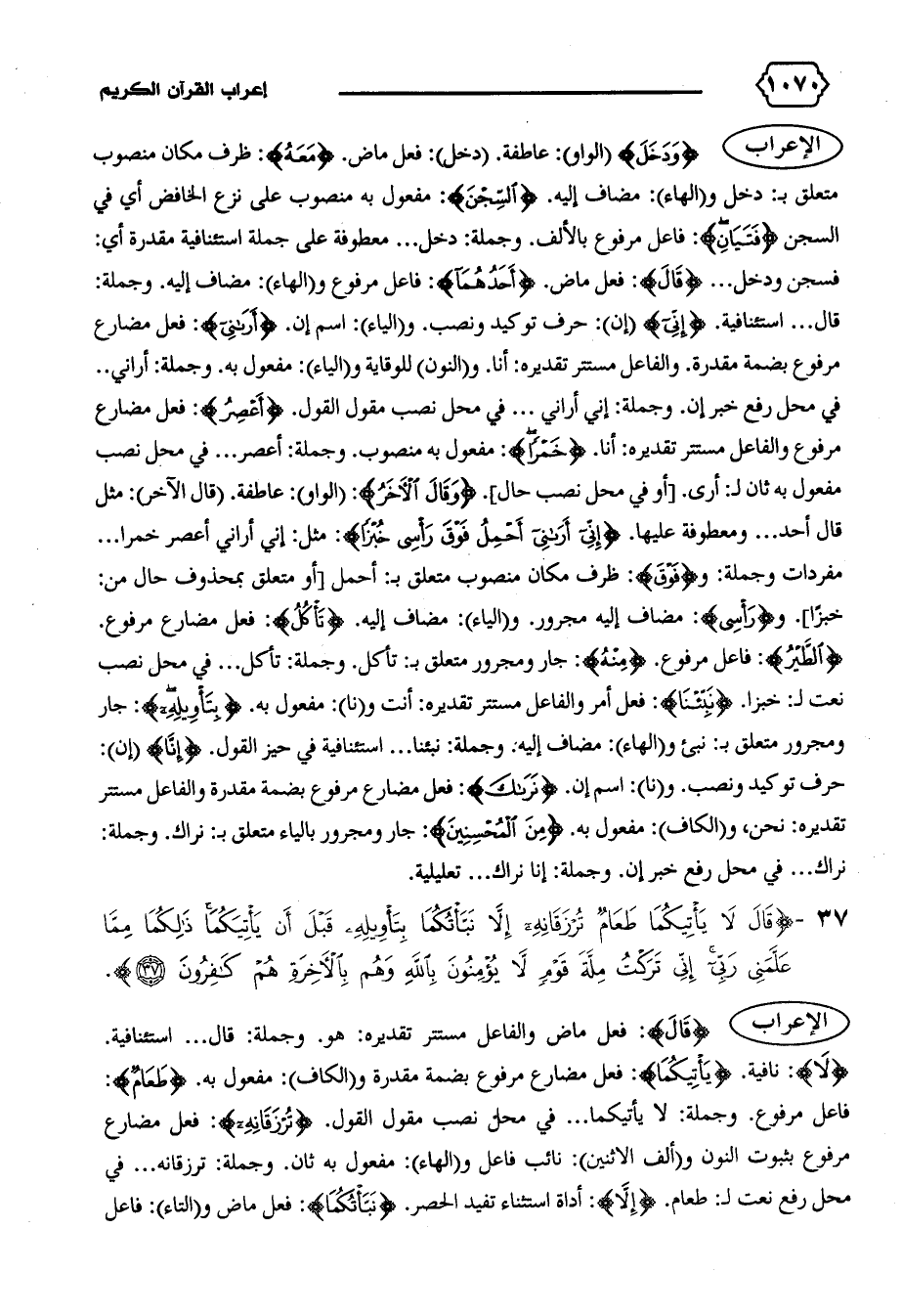 في محل رفع خبر إن. وجملة: إني أراني ... في محل نصب مقول القول. {أَعْصِرُ}: فعل مضارع مرفوع والفاعل مستتر تقديره: أنا. {خَمْراً}: مفعول به منصوب. وجملة: أعصر ... في محل نصب مفعول به ثان ل: أرى. [أو في محل نصب حال]. {وَقالَ الْآخَرُ}: (الواو): عاطفة. (قال الآخر): مثل قال أحد ... ومعطوفة عليها. {إِنِّي أَرانِي أَحْمِلُ فَوْقَ رَأْسِي خُبْزاً}: مثل: إني أراني أعصر خمرا