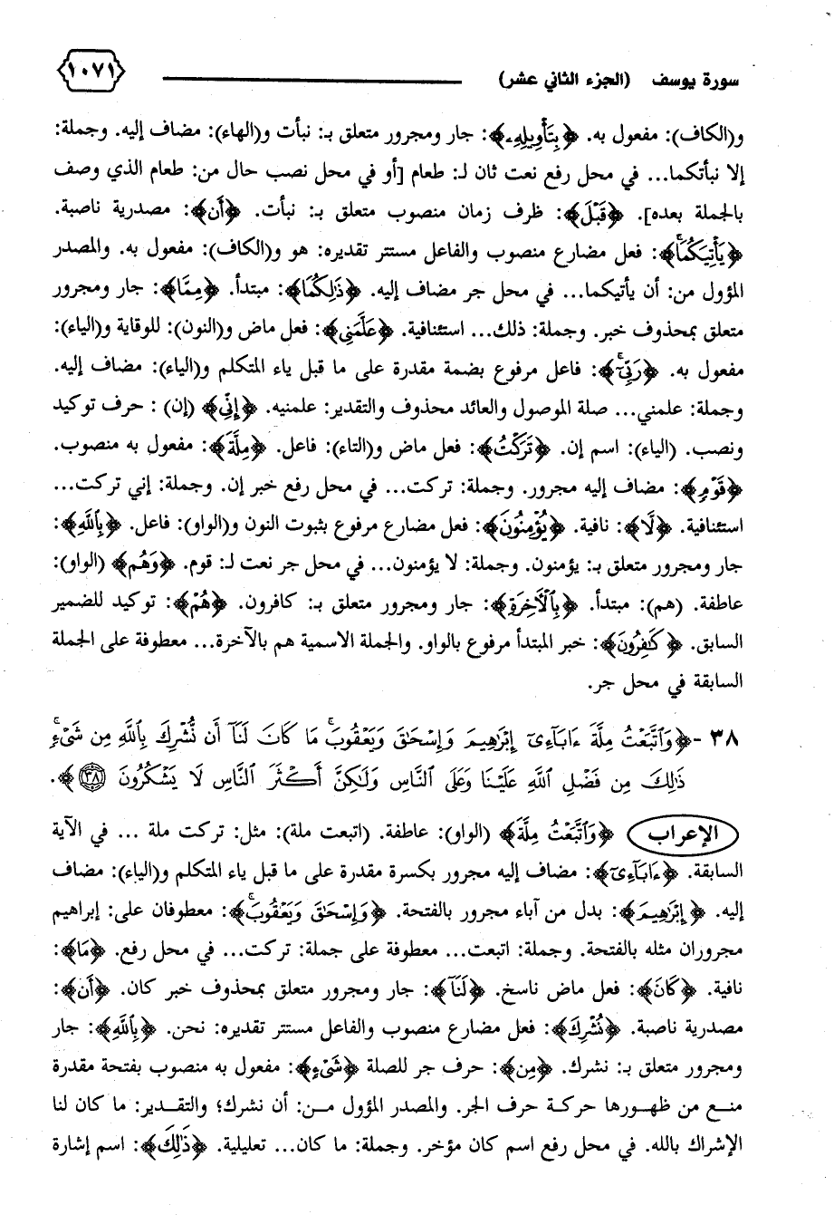 الإعراب {وَاتَّبَعْتُ مِلَّةَ} (الواو): عاطفة. (اتبعت ملة): مثل: تركت ملة ... في الآية السابقة. {آبائِي}: مضاف إليه مجرور بكسرة مقدرة على ما قبل ياء المتكلم و (الياء): مضاف إليه. {إِبْراهِيمَ}: بدل من آباء مجرور بالفتحة. {وَإِسْحاقَ وَيَعْقُوبَ}: معطوفان على: إبراهيم مجروران مثله بالفتحة. وجملة: اتبعت ... معطوفة على جملة: تركت ... في محل رفع. {ما}: