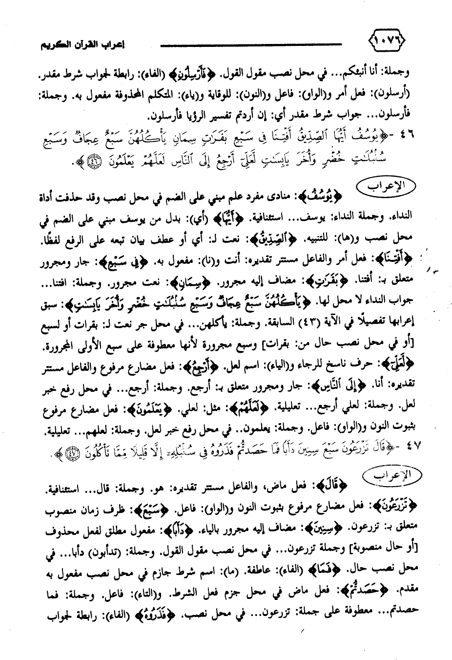 جواب النداء لا محل لها. {يَأْكُلُهُنَّ سَبْعٌ عِجافٌ وَسَبْعِ سُنْبُلاتٍ خُضْرٍ وَأُخَرَ يابِساتٍ}: سبق إعرابها تفصيلا في الآية (٤٣) السابقة. وجملة: يأكلهن ... في محل جر نعت ل: بقرات أو لسبع [أو في محل نصب حال من: بقرات] وسبع مجرورة لأنها معطوفة على سبع الأولى المجرورة.