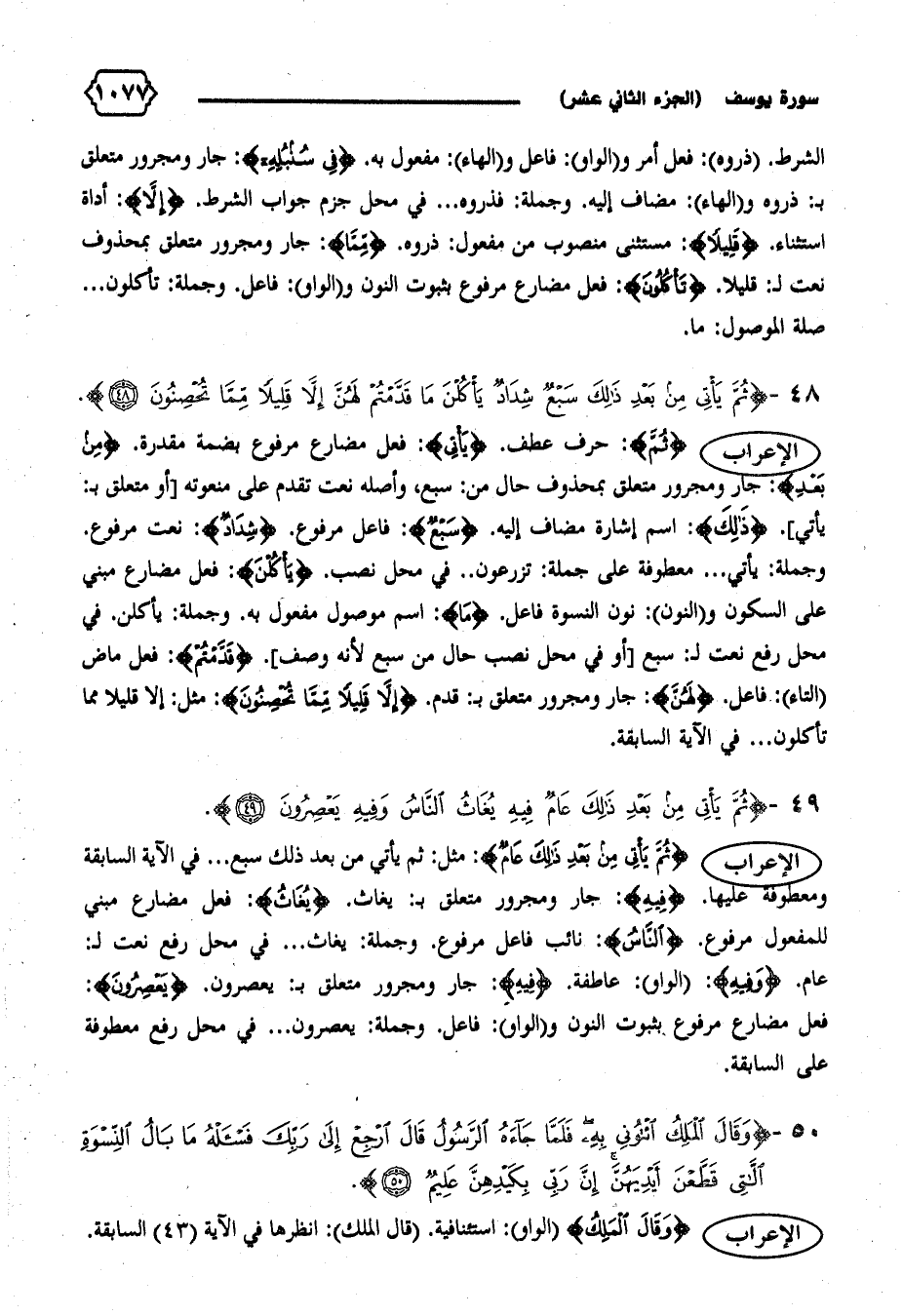 الإعراب {ثُمَّ يَأْتِي مِنْ بَعْدِ ذلِكَ عامٌ}: مثل: ثم يأتي من بعد ذلك سبع ... في الآية السابقة ومعطوفة عليها. {فِيهِ}: جار ومجرور متعلق ب: يغاث. {يُغاثُ}: فعل مضارع مبني للمفعول مرفوع. {النّاسُ}: نائب فاعل مرفوع. وجملة: يغاث ... في محل رفع نعت ل:
