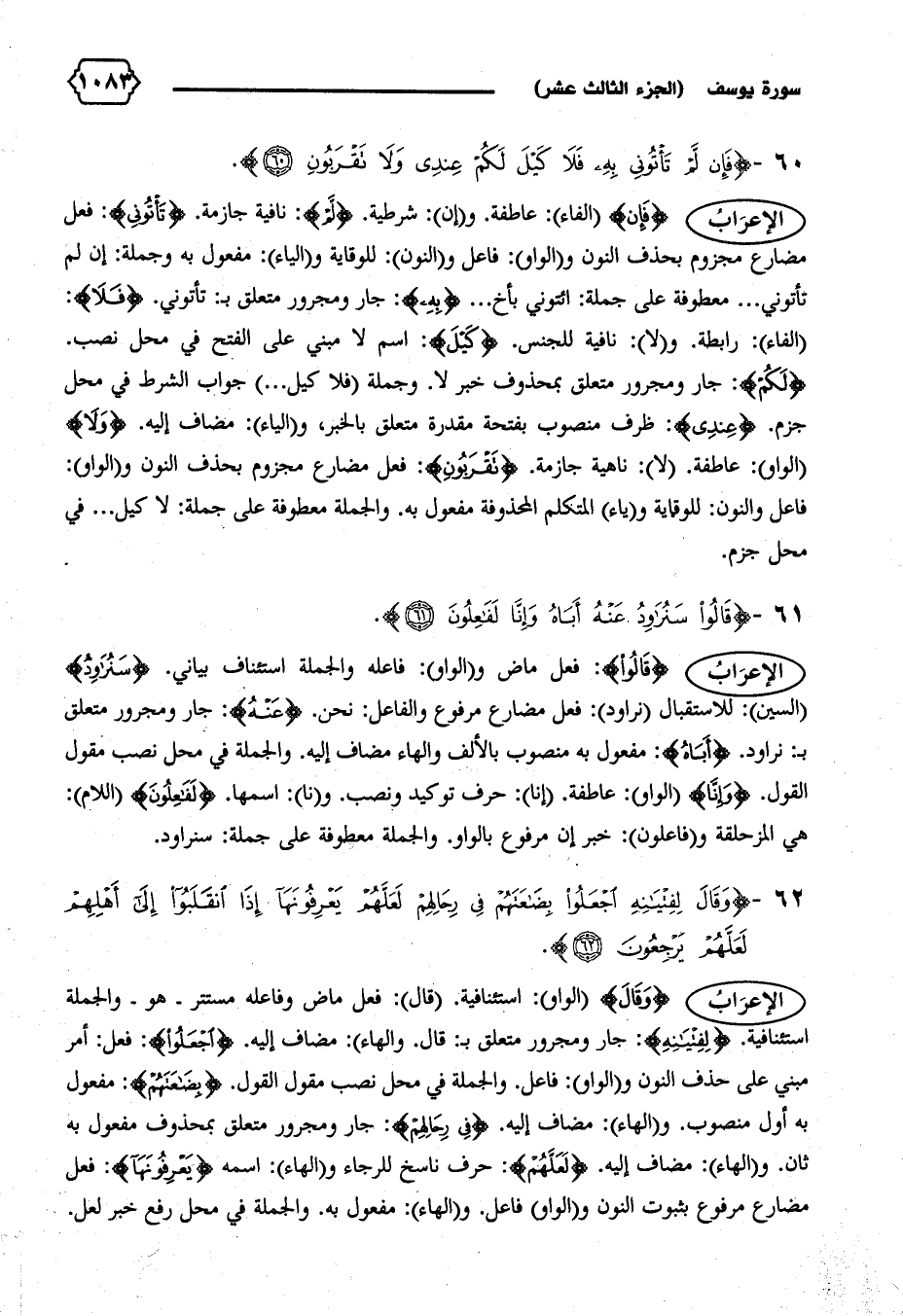 الإعراب {وَقالَ} (الواو): استئنافية. (قال): فعل ماض وفاعله مستتر-هو-والجملة استئنافية. {لِفِتْيانِهِ}: جار ومجرور متعلق ب: قال. و (الهاء): مضاف إليه. {اِجْعَلُوا}: فعل: أمر مبني على حذف النون و (الواو): فاعل. والجملة في محل نصب مقول القول. {بِضاعَتَهُمْ}: مفعول به أول منصوب. و (الهاء): مضاف إليه. {فِي رِحالِهِمْ}: جار ومجرور متعلق بمحذوف مفعول به ثان. و (الهاء): مضاف إليه. {لَعَلَّهُمْ}: حرف ناسخ للرجاء و (الهاء): اسمه {يَعْرِفُونَها}: فعل مضارع مرفوع بثبوت النون و (الواو) فاعل. و (الهاء): مفعول به. والجملة في محل رفع خبر لعل.