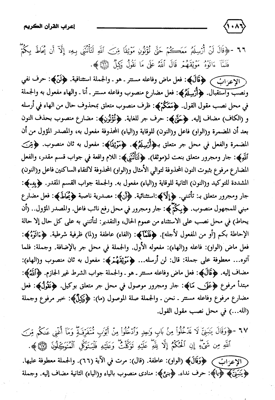 الإعراب {قالَ}: فعل ماض وفاعله مستتر-هو-والجملة استئنافية. {لَنْ}: حرف نفي ونصب واستقبال. {أُرْسِلَهُ}: فعل مضارع منصوب وفاعله مستتر-أنا-والهاء مفعول به والجملة في محل نصب مقول القول. {مَعَكُمْ}: ظرف منصوب متعلق بمحذوف حال من الهاء في أرسله و (الكاف) مضاف إليه. {حَتّى}: حرف جر للغاية. {تُؤْتُونِ}: مضارع منصوب بحذف النون بعد أن المضمرة و (الواو) فاعل و (النون) للوقاية و (الياء) المحذوفة مفعول به، والمصدر المؤول من أن المضمرة والفعل في محل جر متعلق ب {أُرْسِلَهُ}. {مَوْثِقاً}: مفعول به ثان منصوب. {مِنَ اللهِ}: جار ومجرور متعلق بنعت ل (موثقا). {لَتَأْتُنَّنِي}: اللام واقعة في جواب قسم مقدر، والفعل المضارع مرفوع بثبوت النون المحذوفة لتوالي الأمثال و (الواو) المحذوفة لالتقاء الساكنين فاعل و (النون) المشددة للتوكيد و (النون) الثانية للوقاية و (الياء) مفعول به. والجملة جواب القسم المقدر. {بِهِ}:
