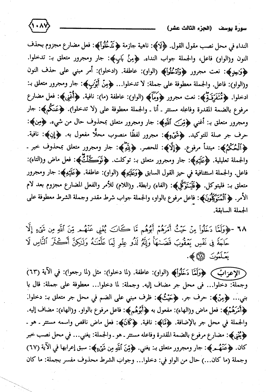 ادخلوا. {مُتَفَرِّقَةٍ}: نعت مجرور {وَما} (الواو): عاطفة (ما): نافية. {أُغْنِي}: فعل مضارع مرفوع بالضمة المقدرة وفاعله مستتر-أنا-والجملة معطوفة على (لا تدخلوا). {عَنْكُمْ}: جار ومجرور متعلق ب: أغني {مِنَ اللهِ}: جار ومجرور متعلق بمحذوف حال من شيء. {مِنْ}: