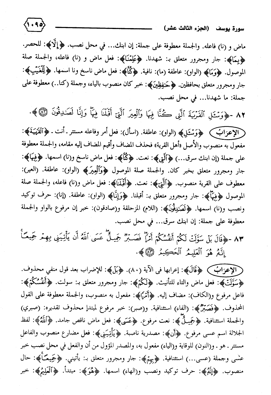 فاعل مرفوع و (الكاف): مضاف إليه. {أَمْراً}: مفعول به منصوب، والجملة معطوفة على القول المحذوف. {فَصَبْرٌ}: (الفاء) استئنافية. و (صبر): خبر مرفوع لمبتدإ محذوف تقديره: (صبري) والجملة استئنافية. {جَمِيلٌ}: نعت مرفوع. {عَسَى}: فعل ماض ناقص جامد. {اللهُ}: لفظ الجلالة اسم عسى مرفوع. {أَنْ}: مصدرية ناصبة. {يَأْتِيَنِي}: فعل مضارع منصوب والفاعل مستتر-هو-و (النون) للوقاية و (الياء) مفعول به، والمصدر المؤول من أن والفعل في محل نصب خبر عسى وجملة (عسى ... ) استئنافية. {بِهِمْ}: جار ومجرور متعلق ب: يأتيني. {جَمِيعاً}: حال منصوب. {إِنَّهُ}: حرف توكيد ونصب و (الهاء) اسمها. {هُوَ}: مبتدأ. {الْعَلِيمُ}: خبر